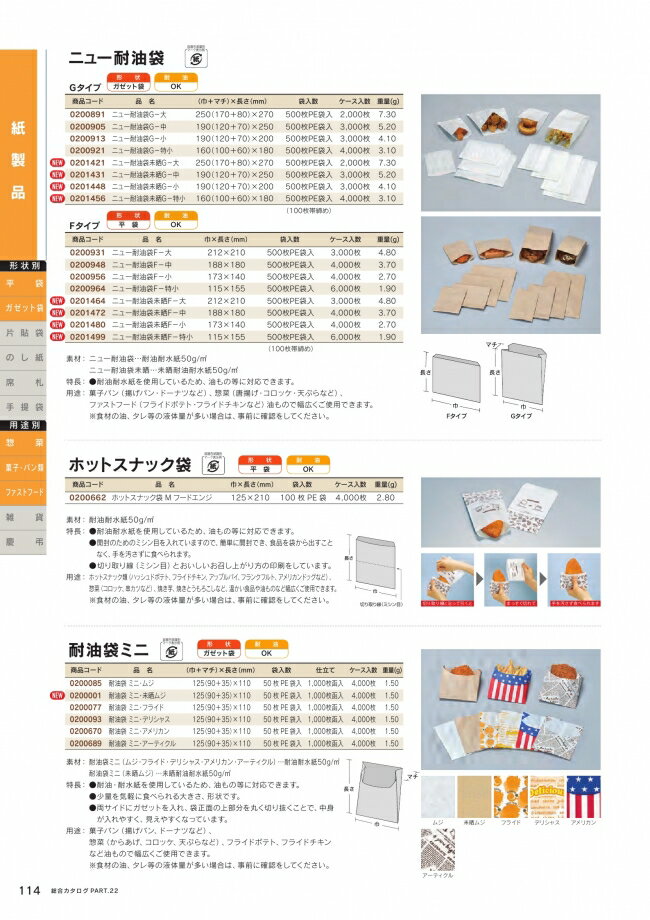 サイズ:115×155mm 商品説明●特徴耐油耐水紙を使用しているため、油もの等にも対応できます。 ●用途 揚げ物惣菜・揚げパン・油菓子など幅広くご使用いただけます。 ●ラインナップ マチありのGタイプ・マチなしのFタイプがございます。・Gタイプ大 250(170+80)×270mm中 190(120+70)×250mm小 190(120+70)×200mm特小 160(100+60)×180mm・Fタイプ大 212×210mm中 188×180mm小 173×140mm特小 115×155mm※取り寄せ商品の為、キャンセルや返品はお受けできません。