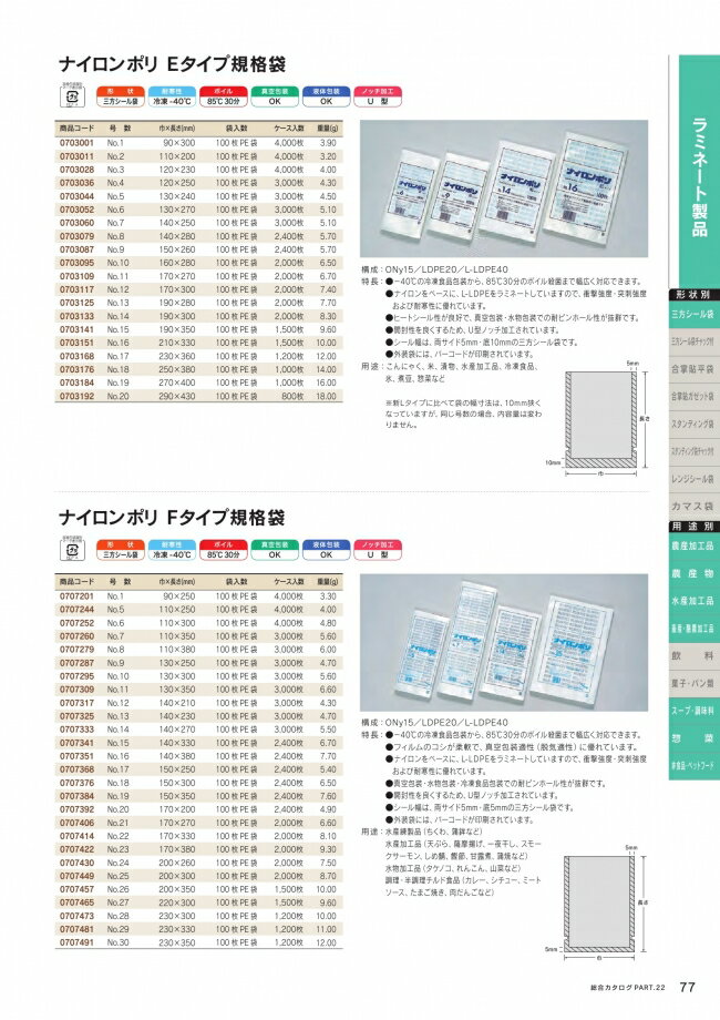 サイズ:0.075×130×350mm重量:6.6g構成:ONy15/LDPE20/L-LDPE40 商品説明■ナイロンポリ F タイプ規格袋 三方シール袋■・-40度の冷凍食品包装から、85度30分の高温ボイル殺菌まで幅広く対応できます。・フィルムのコシが極めて柔軟で、真空包装適正(脱気適正)に優れています。・ナイロンをベースに、L-LDPEをラミネートしていますので、衝撃強度、突刺強度および、耐寒性に優れています。・真空包装、水物包装、冷凍食品での耐ピンホール性が抜群です。・開封性を良くするため、U型ノッチ加工されています。・シール幅は、両サイド5mm、底5mmの三方シール袋です。・外装袋には、バーコードが印刷されています。・水産練製品:ちくわ、蒲鉾など・水産加工品:天ぷら、薩摩揚げ、一夜干し、スモークサーモン、しめ鯖、鰹節、甘露煮、蒲焼など・水物加工品:タケノコ、れんこん、山菜など・料理、半料理チルド食品:カレー、シチュー、ミートソース、たまご焼き、肉だんごなど※取り寄せ商品の為、キャンセルや返品はお受けできません。