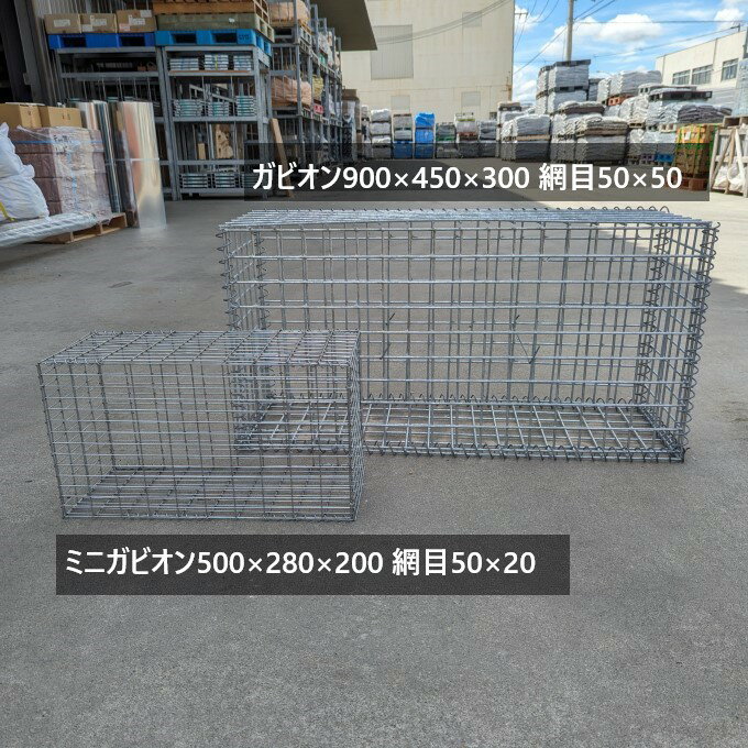 ポイント 小さな石でもはみ出ないように格子を狭くし強度も持たせ、狭くしても石が目立つよう線径を細くしました。また横長の格子にすることで洋風を演出しています。小さくても本格的な蛇籠、自然石を詰めてお庭や玄関ポーチの「オブジェ」や「仕切り」「土留め」など空間にアクセントに、オシャレに演出します。 この商品は ミニガビオン280型 500×280×200 線径2.3 網目 20×50(単位mm)亜鉛処理済 サンプル画像のガビオン280型には50~100mmの石で40kg分ほど入りました。 この商品は ミニガビオン200型 200×200×200 線径2.3 網目 20×50(単位mm)亜鉛処理済 サンプル画像のガビオン200型にはバークチップを入れてみました。横向きのバークチップははみ出てきます。すべてをバークチップにすると費用がかさむので真ん中には発砲スチロールでかさ増ししています。石を入れるとすると50~100mmの石で11~12kg入ります。 【入る石の重量】 ミニガビオン500×280×200mm 約40kg ミニガビオン200×200×200mm 約12kg ガビオン450×450×450mm 約150kg ガビオン900×450×300mm 約200kg ガビオン900×450×450mm 約300kg ガビオン1200×300×900mm 約520kg ガビオン1800×600×300mm 約520kg 大き目ガビオンはこちら