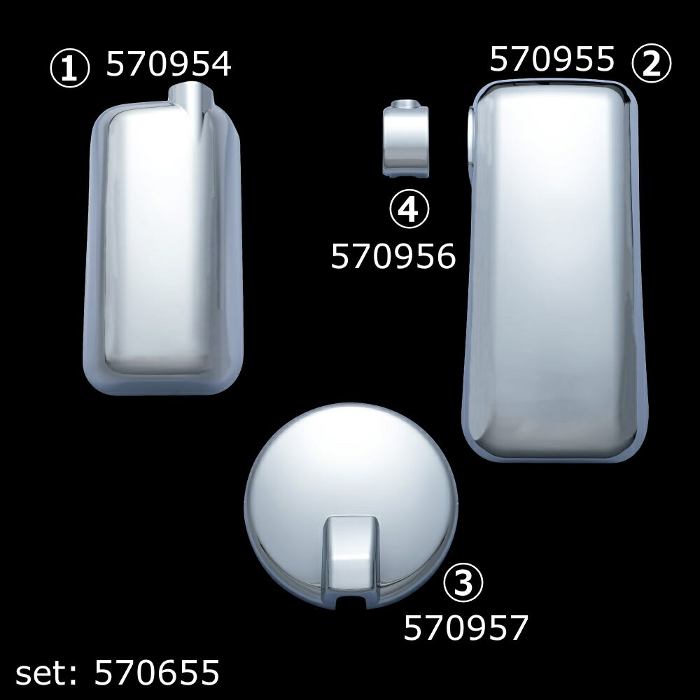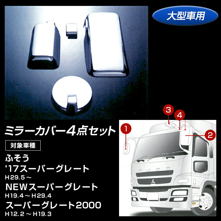 ミラーカバー4点セット ふそう '17スーパーグレート/NEWスーパーグレート/スーパーグレート2000 セット詳細※各部品名をクリックすると商品ページに移動します。 サイドミラー運転席側 サイドミラー助手席側 アンダーミラー ミラーホルダー ※ミラーホルダーはサイドミラーと一対となる商品です。 商品詳細 商品名 ミラーカバー4点セット ふそう '17スーパーグレート/NEWスーパーグレート/スーパーグレート2000 大型車用 商品コード 570655 メーカー ジェットイノウエ 適合車種(年式) ふそう '17スーパーグレート (H29.5〜) NEWスーパーグレート (H19.4〜H29.4) スーパーグレート2000 (H12.2〜H19.3) 材質 樹脂/クロームメッキ 左右の純正ミラーサイズ外寸(約) 単位:mm ①サイドミラー運転席側:縦370×横193 ②サイドミラー助手席側:縦550×横247 ③アンダーミラー:直径263 取付方法 両面テープとタッピングビスを使用して取り付け 注意事項 ・ミラーカバーをお取り付けの際は、ミラー本体の汚れ・油分などをよく落としてから行って下さい。 ・純正のミラーを一度外してから装着するタイプのミラーカバーを取り付けする場合は純正のミラーをミラーステーに十分締め付けしてからミラーカバーを取り付けしてください。ミラーカバーを装着後、締め付けができない場合があります。 ・メーカーで設定したセットの内容と異なるミラーを装着した車両もあります。 また、補修用として純正以外のミラーが装着されている場合がありますのでご注意下さい。 ・一部取り付けできない車両もありますので適合車種、年式等はあくまで参考にして下さい。 ・ミラーホルダーはジェットイノウエ以外のメッキミラーカバーには適合しません。 ・汎用品のため対応車種であっても適合しない場合もございます。 ミラーカバー商品一覧はこちら >