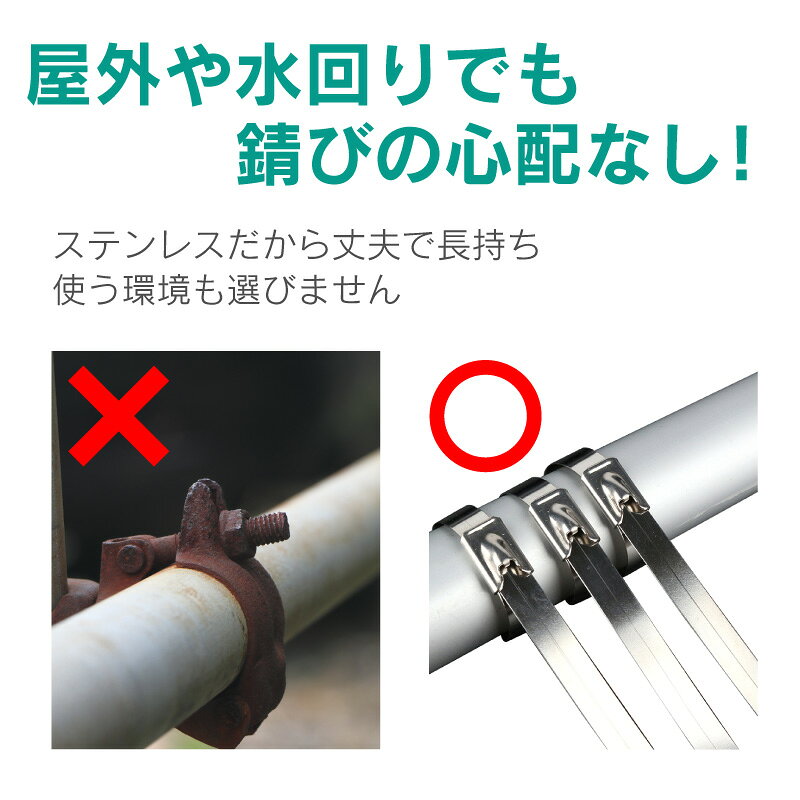 ■商品説明 結束バンド ステンレス 300mm 屋外や水回りでも錆の心配なし SUS304ステンレスを使用。丈夫で長持ちのため使う環境を選びません。 活躍シーンは無限大 配管工事、配線工事、ケーブル整理、ガーデニング、バイク整備、自動車整備など様々な場面で大活躍 強固な結束力 侵食性・強度に優れた304ステンレス製。 ヘッド部分にはロック機能を搭載し、長期間使用しても緩む心配がありません。 長さ調節可能 ニッパーで切ることが可能です。 ■商品の仕様 サイズ (幅)4.5mm×(長さ)300mm 入り数 100本 ■レビューについて 「みんなのレビュー」に投稿してみましょう♪ 宜しければお客様のご意見やご感想をお聞かせくださいませ ・商品が到着したらレビューを投稿してみましょう ・レビューは購入履歴の画面からご投稿頂けます 購入履歴画面 ・レビューの内容は当店のサービス向上などのために役立たせていただきます