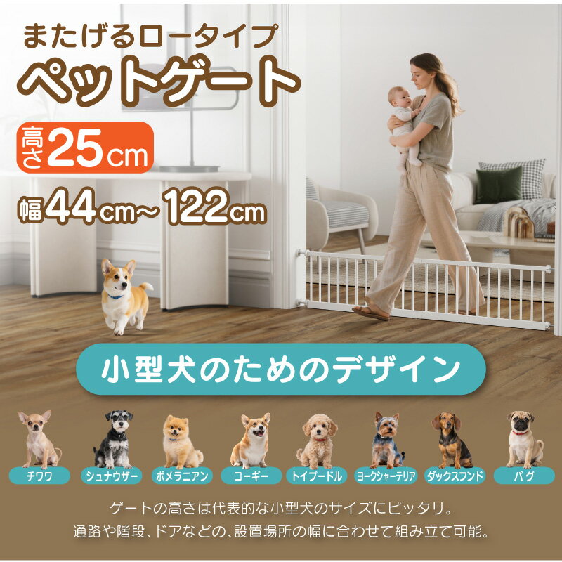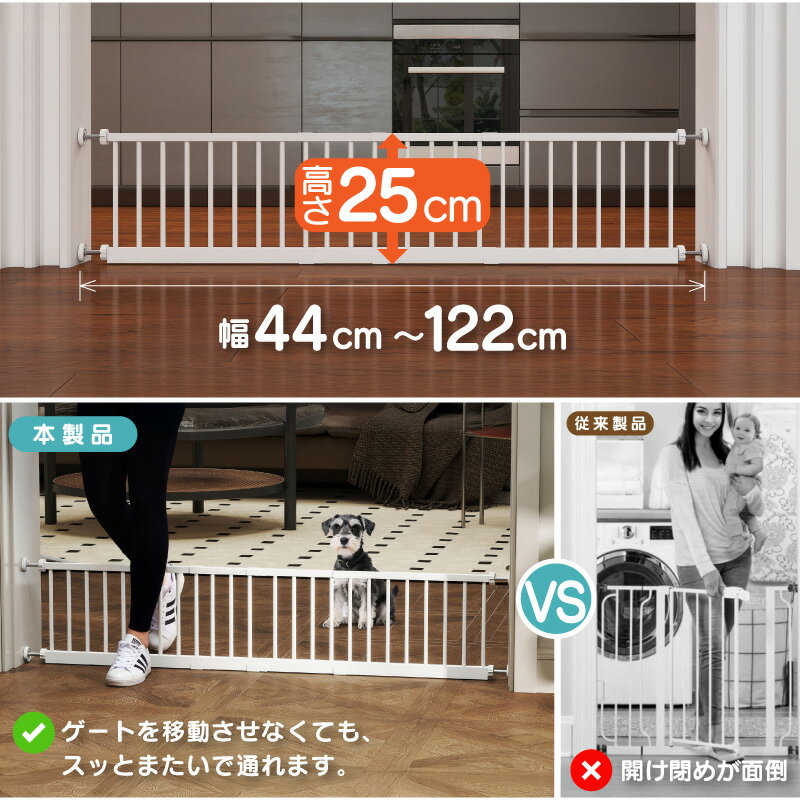 ペットゲート ロー タイプ ロータイプ 穴あけ不要 突っ張り 高さ 低め 25cm またげる 幅 44cm〜122cm 小型犬 中型犬 ペットフェンス ペットガード 室内 通せんぼ とうせんぼ スチール製 脱走防止 玄関 廊下 キッチン 階段 バルコニー ゲート フェンス 20cm セーフティゲート