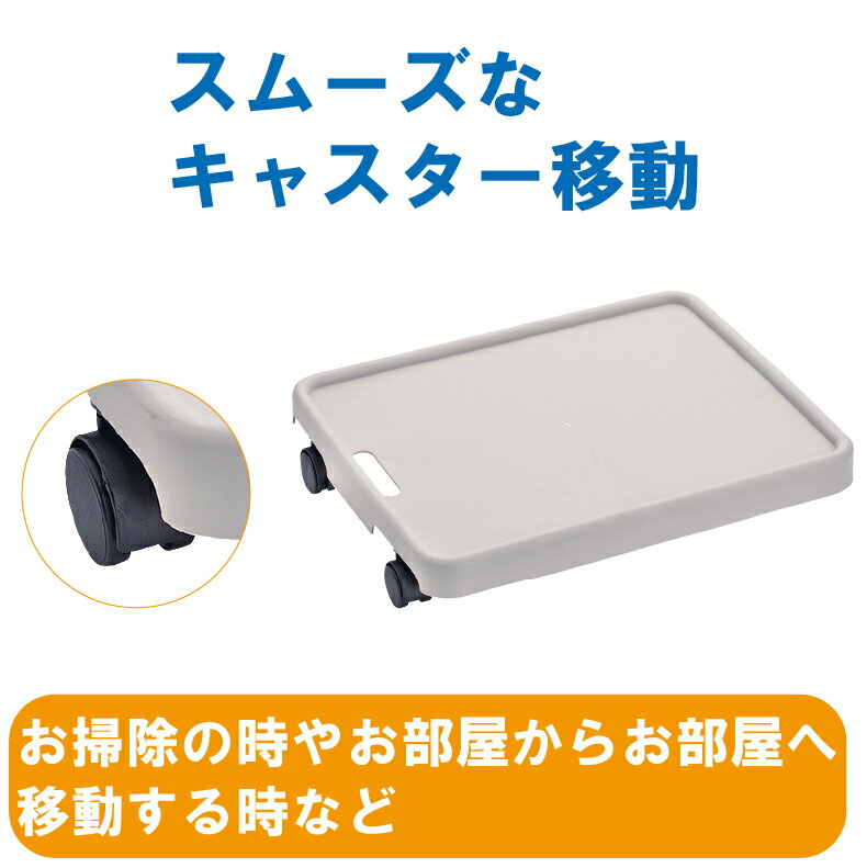 ファンヒーターをラクラク移動 約600gの軽量設計で、お掃除の時やお部屋からお部屋へ移動する時など、女性や高齢者でも無理なく使用できます。スムーズなキャスター移動キャスターはポリプロピレンとポリカーボネートで作られており、滑らかな動きと耐久性を兼ね備えています。段差や凹凸のある地面でもスムーズに移動が可能。耐荷重約40kgの頑丈さ耐荷重は約40kg!ファンヒーターだけでなく大きな植木や日常の重い荷物の運搬など、さまざまなシーンで活躍します。しっかりとした安定感があり、安心して重い荷物を運べます。