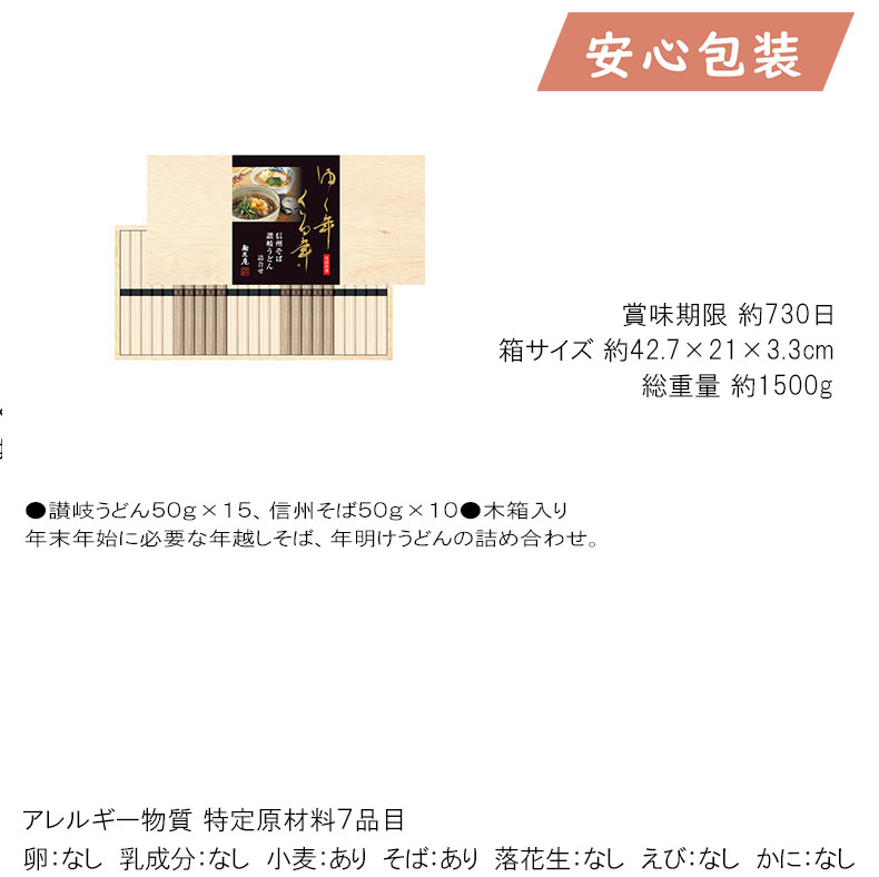 ●讃岐うどん50g×15、信州そば50g×10●木箱入り 年末年始に必要な年越しそば、年明けうどんの詰め合わせ。 箱サイズ 約42.7×21×3.3cm 総重量 約1500g 賞味期限 約730日 アレルギー物質 特定原材料7品目 卵:なし 乳成分:なし 小麦:あり そば:あり 落花生:なし えび:なし かに:なし ■さまざまなギフトアイテムをご用意しております。 お気軽にお問い合わせください。 内祝 内祝い お祝い返し ウェディングギフト ブライダルギフト 引き出物 引出物 結婚引き出物 結婚引出物 結婚内祝い 出産内祝い 命名内祝い 入園内祝い 入学内祝い 卒園内祝い 卒業内祝い 就職内祝い 新築内祝い 引越し内祝い 快気内祝い 開店内祝い 二次会 披露宴 お祝い 御祝 結婚式 結婚祝い 出産祝い 初節句 七五三 入園祝い 入学祝い 卒園祝い 卒業祝い 成人式 就職祝い 昇進祝い 新築祝い 上棟祝い 引っ越し祝い 引越し祝い 開店祝い 退職祝い 快気祝い 全快祝い 初老祝い 還暦祝い 古稀祝い 喜寿祝い 傘寿祝い 米寿祝い 卒寿祝い 白寿祝い 長寿祝い 金婚式 銀婚式 ダイヤモンド婚式 結婚記念日 ギフト ギフトセット セット 詰め合わせ 贈答品 お返し お礼 御礼 ごあいさつ ご挨拶 御挨拶 プレゼント お見舞い お見舞御礼 お餞別 引越し 引越しご挨拶 記念日 誕生日 父の日 母の日 敬老の日 記念品 卒業記念品 定年退職記念品 ゴルフコンペ コンペ景品 景品 賞品 粗品 お香典返し 香典返し 志 満中陰志 弔事 会葬御礼 法要 法要引き出物 法要引出物 法事 法事引き出物 法事引出物 忌明け 四十九日 七七日忌明け志 一周忌 三回忌 回忌法要 偲び草 粗供養 初盆 供物 お供え お中元 御中元 お歳暮 御歳暮 お年賀 御年賀 残暑見舞い 年始挨拶 話題 のし無料 メッセージカード無料 ラッピング無料 手提げ袋無料 大量注文関連商品 KJ50N 自然芋そば そば・つゆ詰合せ YKUB-50Kゆく年くる年 KJ30S 自然芋そば そば・つゆ詰合せ BOU-30信州蕎麦と讃岐饂飩詰合 NOK-55クラフトパスタ AOS-30B年越し・迎春ギフト NOK-35クラフトパスタ AOS-40D年越し迎春ギフト MKDH-50ミカドヘルシー 価格帯 3980円以下→ 商品ジャンル 麺類→