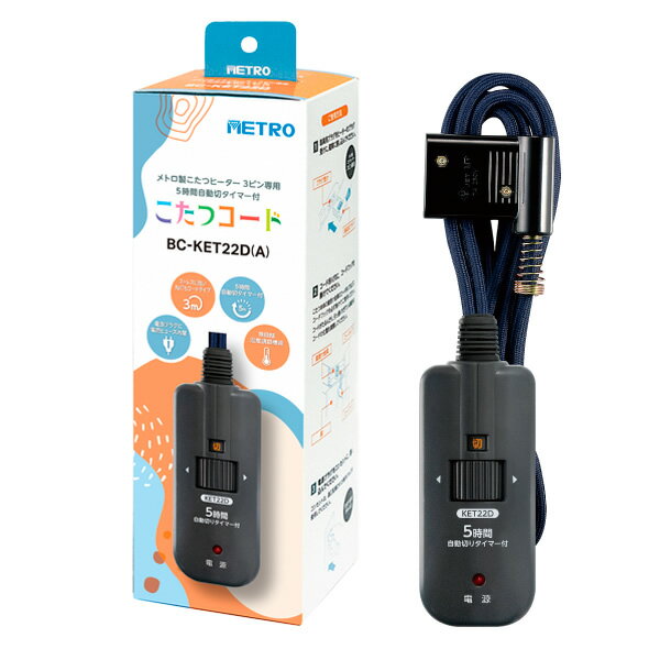 ■ メトロ電気工業(METRO) ■こたつコード BC-KET22D(A)◆ 主な特長 ◆・こたつの温度を手元でらくらくコントロールできる手元電子コントローラー。・切り忘れ防止に、安心の5時間自動オフタイマー付き。・プラグ内に電流ヒューズ内蔵。異常電流が流れると瞬時に電源を遮断。・引っ張りや圧縮などのストレスに強いに丸打ちコードタイプ。・L字型器具用プラグでコードが傷みにくい◆ 主な仕様 ◆■定格:AC125V 7A■電源コード:丸打ちコード■安全装置:電流ヒューズ■長さ:3m■3ピンタイプ■電力自動コントロール■5時間切タイマー内蔵※旧型番:BC-KET22D※この電子コントローラーは、一部のヒーターユニットでの使用は推奨しておりません。交換用としてご使用の場合はメーカーホームページの「こたつコード取替ナビ」をご確認ください。※こたつ以外の電気器具には使用しないでください。※他社メーカーのヒーターユニットには使用できません。※メーカーページ等で対応型番をご確認の上ご購入ください。簡易商品仕様シリーズ名:-ブランド名:メトロ電気工業|METORO|メトロメーカー型番:BC-KET22D-A代表カラー:ブラックカラー:ブラックブランド名(カナ):メトロ