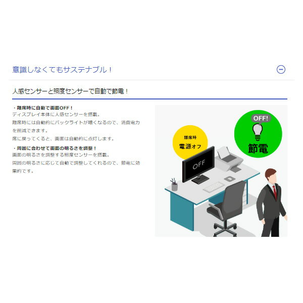 ■ IOデータ ■BizCrystaがあなたのオフィスをより明るく快適に。◆ 主な特長 ◆人感センサーと照度センサーで自動で節電!離席時に自動で画面OFF!ディスプレイ本体に人感センサーを搭載。周囲に合わせて画面の明るさを調整!画面の明るさを調整する照度センサーを搭載。パソコンの電源と連動して、無駄な消費電力をカット!パソコンの状態に連動して、自動的に液晶ディスプレイの電源をオフにすることができます。ディスプレイへの近づきすぎを防止!人感センサーでディスプレイとの距離を感知し、指定の距離より近づいた場合は注意喚起するメッセージを表示します。環境光にあわせて明るさを自動調整!ディスプレイ周辺の明るさに応じて画面の明るさを自動調整するため、目の負担をやわらげます。黄色味を抑えながらブルーライトを低減させる「ブルーリダクション2」本商品はディスプレイ自体がブルーライトを低減させる機能「ブルーリダクション2」を搭載。連続使用をお知らせする「VDTモード」を搭載近年、IT化が急速に進められ、パソコンを中心とした電子機器を使った仕事が広く職場に導入されてきたことに伴い、パソコンの長時間使用により、目の疲れなどを訴える方が増えてきていると言われています。ケーブル1本で3画面にできるデイジーチェーン採用!ノートパソコンからUSB Type-Cケーブル1本でディスプレイに接続できます。◆ 主な仕様 ◆■対応OS(日本語版のみ)OSには依存しないため全て(本体未対応OSは除く)■対応パソコン機種Windowsパソコン、Mac、Chromebook■パネルタイプ:TFT27型ワイド/ADS■パネル表面処理:非光沢■最大表示解像度:2560×1440■最大表示色:1677万色■視野角度:上下:178° 左右:178°■最大輝度(標準値):300cd/m2■コントラスト比(標準値):1000:1■対応最大リフレッシュレート(Hz)[最大解像度時]:75■映像入力端子:HDMI×1、DisplayPort×1、USB Type-C×1■映像出力端子:USB Type-C×1(デイジーチェーン用)■LAN端子:RJ-45×1(1000BASE-T/100BASE-TX/10BASE-T)■USBポート・アップストリーム【HUB、映像入力、電源供給】USB Type-C×1:USB 5Gbps(USB 3.2 Gen 1)、DisplayPort Alt Mode、Power Delivery最大65W(5V/3A、9V/3A、15V/3A、20V/3.25A)・ダウンストリーム【HUB、映像出力】USB Type-C×1:USB 5Gbps(USB 3.2 Gen 1)、DisplayPort Alt Mode(デイジーチェーン動作時)【HUB】USB Std-A×2、USB Type-C×1:USB 5Gbps(USB 3.2 Gen 1)【システム更新】USB Std-A×1:USB 2.0(最大5V/1A)■音声入出力音声入力:マイク入力(ヘッドホン端子)スピーカー:2W+2W(ステレオ)ヘッドホン端子:ステレオミニジャック φ3.5mm(4極CTIA)■定格電圧:AC100V 50/60Hz(電源内蔵)■消費電力最大時:130W通常使用時(オンモード):18.4W年間消費電力量:62.2kWh待機時:1.1W■外形寸法(W×D×H)スタンドあり:約613×229×395〜525mm ※突起部を含まずスタンドなし:約540×50×325mm ※突起部を含まず■質量(kg)スタンドあり:約7.6kgスタンドなし:約5.2kg■添付品:電源コード(PSE適合品)、C-C USB 5Gbps(USB 3.2 Gen 1)ケーブル、台座、台座ネック、台座ネック取付ネジ(4本)、WEBカメラ取付ネジ(1本)、必ずお読みください簡易商品仕様ブランド名:IOデータメーカー型番:LCD-BCQ271DW-F代表カラー:ホワイトHDMI端子:有USB:有VESAマウント:有スピーカー搭載:有ディスプレイ視野角:上下:178° 左右:178°モニタタイプ:ワイド応答速度:5ms画面サイズ:27inカラー:ホワイトブランド名(カナ):アイ・オー・データ本体奥行:229mm本体横幅:613mm本体高さ:395mm本体重量:7.6kg最大表示色:1677万色