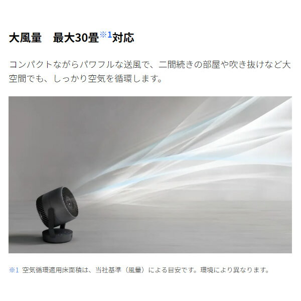 ■ SHARP(シャープ) ■自然の力を応用した、大風量プラズマクラスターサーキュレーター◆ 主な特長 ◆●最大30畳対応の大風量モデル。ネイチャーウイング搭載で、運転音を抑えながらしっかり循環します。●プラズマクラスターNEXT当社史上最高濃度のプラズマクラスターNEXT搭載。イオンの風で部屋干しの生乾きのニオイをしっかり消臭します。※1*●使いやすさ工具を使わずパーツを外して水洗いできるので、清潔です。※2 風向・風量等の調節機能も充実しています。ニオイの種類・強さ・対象物の素材などによって、消臭効果は異なります。吹き出す風の当たらない部分のニオイは取れません。※1・試験機関:当社調べ ・試験方法:機器の吹き出し方向に約1mの位置に生乾き臭のニオイ成分がしみこんだ試験片を置いて消臭効果を6段階臭気強度表示法にて評価。■試験結果:約1時間で気にならないレベルまで消臭。衣類乾燥運転「風量最大」運転で実施。※2前ガード、ファン、後ろガード◆ 主な仕様 ◆■空気循環適用床面積(目安)※1:〜30畳(約50m2)■プラズマクラスター適用床面積(目安)※2:約10畳(約17m2)■モーター:DCモーター■消費電力※3:21W[2.5W]■風量切替:10段階■羽根径/枚数:18cm/3枚[ネイチャーウイング]■首振り(スイング)※4上下:上向き:約60°、下向き:約60°、上下:約140°(自動)左右:約60°、約90°、約120°(自動)■風向調節範囲上下:上 約90°〜下 約50°左右:左 約60°〜右 約60°■タイマー入/切※5:1〜9h(1時間単位)■運転モード:連続・リズム・おやすみ・衣類乾燥■チャイルドロック:〇■メモリー機能※6:〇■定格入力:AC100V-240V 50/60Hz■定格出力:DC24V 2.0A■電源方式:ACアダプター■外形寸法:W253×D197×H329mm/コード長さ約1.8m■質量(付属品は除く):約2.6kg■付属品※7:リモコン・ACアダプター※1空気循環適用床面積は当社基準(風量)による目安です。環境により異なります。※2商品を壁際に置いて、「風量最大」運転時に、部屋中央(床上1.2m)で50,000個/cm3のイオンが測定できる床面積の目安です。※3風量最大運転時、上下・左右首振りあり。[ ]内は風量最小運転時、上下・左右首振りなし。※4上向きは、上約50°〜下約10°、下向きは上約10°〜下約50°、上下は上約90°〜下約50°です。※5同時設定不可。※6連続・おやすみ・衣類乾燥の設定内容(風量・タイマー・首振り)を記憶します。停止後、再度電源を入れると連続モードの前回の設定からスタートします。ACアダプターを抜くとリセットされます。※7リモコンは磁石使用。電池セット済。ユニット清掃ブラシは本体にセット。取扱説明書(保証書付)。簡易商品仕様シリーズ名:-ブランド名:SHARP|シャープメーカー型番:PK-18S02-B代表カラー:ブラック自動首振り設定:上下/左右扇風機・サーキュレーターのスタイル:据置き型本体横幅:25.3cm本体高さ:32.9cmモーター種類:DCモーターカラー:アッシュブラックブランド名(カナ):シャープ