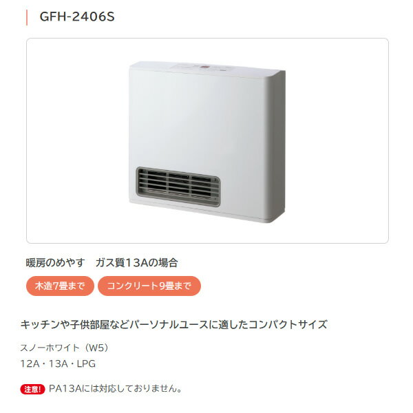 【在庫限り】ガスファンヒーター ノーリツ 都市ガス用 12A13A用 スタンダード 木造7畳/鉄筋9畳まで スノーホワイト GFH-2406S-W5-13【KK9N0D18P】