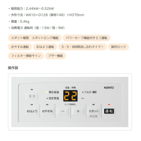 ■ ノーリツ(NORITZ) ■ガスファンヒーター GFH-2406S◆ 主な特長 ◆キッチンや子供部屋などパーソナルユースに適したコンパクトサイズ◆ 主な仕様 ◆■GFH-2406S■2023年製■都市ガス用■暖房のめやす:木造7畳まで、コンクリート9畳まで■暖房能力:2.44kW〜0.52kW■外形寸法:W410×D128(脚部148)×H370mm■質量:5.4kg■消費電力 運転時(強:13W/弱:9W)■スポット暖房/スポットロング機能/パワーセーブ機能付きエコ運転/おやすみ運転/おはよう運転/3・5・8時間消し忘れタイマー/操作ロック/フィルター掃除サイン/ブザー機能簡易商品仕様シリーズ名:Standard Typeブランド名:NORITZ|ノーリツメーカー型番:GFH-2406S-W5-13代表カラー:ホワイトストーブ・ヒーターのタイプ:ガスファンヒーターストーブ・ヒーターの燃料:ガス最大適用畳数(鉄筋):9畳最大適用畳数(木造):7畳使用ガス種類:都市ガス用カラー:スノーホワイトブランド名(カナ):ノーリツシリーズ名(カナ):スタンダードタイプ