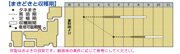 特長 ●食味のよい夏秋栽培用「桃太郎」。玉がかたく裂果や軟果に強い。 ●花質がよく着果が安定し、生理障害果(チャック・変形・空洞・黄変など)の発生も少ない。 ●熟期は中生で果色は濃桃色。果形はスムーズな豊円型で200g程度にそろう。 ●草丈は低いので、誘引回数を減らせる。 ●トマトモザイクウイルス(Tm-2a型)、トマト黄化葉巻病(Ty-3a型)、トマト黄化えそ病(TSWV)、萎凋病レース1(F1)およびレース2(F2)、根腐萎凋病(J3)、半身萎凋病(V1)、葉かび病(Cf9)、すすかび病、斑点病(LS)、サツマイモネコブ線虫(N)に複合耐病性のほか、青枯病(B)にも比較的強い。 蒔き時期は画像をご確認下さい