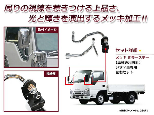 トラック カスタム パーツ デコトラ 大型車 DIY ドレスアップ【適合車種】・メーカー:いすゞ イスズ・車種:07エルフ 標準キャブ用 H19年1月〜 140φ【商品説明】140φ メッキ ミラーステー カバーキャップ付属 RH手動/LH電動セット取り付けに必要な部品は純正品から移植してご使用ください。車両によっては加工が必要な場合がございますので専門業者での取付けをお願いします。・車種によっては、年式・車両型式・タイプが一致していても、特別仕様車等の条件により、記載されている情報と異なる場合がございますので、お客様にご判断の上ご購入下さい。新品・未使用品ですが輸入品になりますので多少の輸送傷等がある場合が御座います。送料:送料無料 (沖縄・離島・一部地域は別途送料加算となります)【注意事項】◆お客様都合による商品ページ未確認や商品加工後の返品・交換・キャンセルは一切行えません。◆メーカー発注商品や姉妹店舗との共有在庫商品の場合、商品により納期にお時間を頂く場合やご注文のタイミングによって欠品となる可能性が御座います。お急ぎの方は事前に納期確認のご連絡を下さい。◆交換等での工賃や車両の損害などはいかなる場合も保証対象外となります。◆必ず加工/取り付け前に動作確認をして下さい。取付・加工後・脱着工賃・取付時の不備・過失傷害・水漏れ等は保証致しかねます。◆お客様御自身での取付作業によるいかなる損害も責任を負いかねますのでご了承ください。◆付属品以外を利用しての取付けは自己責任で行って下さい。◆お車によっては加工が必要な場合がございます。◆保証期間は商品発送日から7日間の初期不良のみです。お荷物送り状が保証書の代わりとなります。◆当店はお取り付けに関するサポートは行なっておりません。技術ある整備工場にてお取付ください。◆モニターの環境によっては実際の商品と色見などが違う場合が御座います。◆商品仕様が予告なく変更される場合が御座います。◆輸入商品の場合は、すれ・傷等がある場合が御座います。◆海外製商品の場合は、必要に応じてコーキング処理を追加してください。◆社外品の場合、純正品では御座いませんので完全一致にはなりません。◆説明書は付属いたしません。◆車種対応については、グレードや年式によって適合が異なる場合がある為、必ずご購入前に現車にて形状・スペース・サイズのご確認の上、最終的な判断はお客様でお願いします。◆商品が到着しましたら、必ず商品内容をご確認ください。予めご了承下さい。