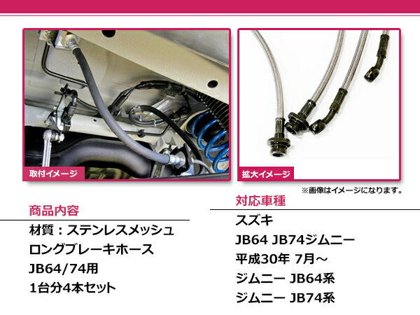 簡単DIYパーツ多数 カスタムパーツ オプションパーツ カーパーツ【適合車種】・メーカー:スズキ・車種:ジムニー ジムニーシエラ・型式:JB64 JB74◆セット内容:4本セット【商品説明】リフトアップ時な必須のロングブレーキホースです。外周にステンメッシュを使用しクリアコーティングを施しております。ステンメッシュを採用することで加圧時のホース膨張を防いでくれます。膨張率が低くなり、制動圧力の立ち上がりが早くなることで、踏力をダイレクトにキャリパーへと伝えますので操作感向上につながります。送料:送料無料 (沖縄・離島・一部地域は別途送料加算となります)【注意事項】◆お客様都合による商品ページ未確認や商品加工後の返品・交換・キャンセルは一切行えません。◆メーカー発注商品や姉妹店舗との共有在庫商品の場合、商品により納期にお時間を頂く場合やご注文のタイミングによって欠品となる可能性が御座います。お急ぎの方は事前に納期確認のご連絡を下さい。◆交換等での工賃や車両の損害などはいかなる場合も保証対象外となります。◆必ず加工/取り付け前に動作確認をして下さい。取付・加工後・脱着工賃・取付時の不備・過失傷害・水漏れ等は保証致しかねます。◆お客様御自身での取付作業によるいかなる損害も責任を負いかねますのでご了承ください。◆付属品以外を利用しての取付けは自己責任で行って下さい。◆お車によっては加工が必要な場合がございます。◆保証期間は商品発送日から7日間の初期不良のみです。お荷物送り状が保証書の代わりとなります。◆当店はお取り付けに関するサポートは行なっておりません。技術ある整備工場にてお取付ください。◆モニターの環境によっては実際の商品と色見などが違う場合が御座います。◆商品仕様が予告なく変更される場合が御座います。◆輸入商品の場合は、すれ・傷等がある場合が御座います。◆海外製商品の場合は、必要に応じてコーキング処理を追加してください。◆社外品の場合、純正品では御座いませんので完全一致にはなりません。◆説明書は付属いたしません。◆車種対応については、グレードや年式によって適合が異なる場合がある為、必ずご購入前に現車にて形状・スペース・サイズのご確認の上、最終的な判断はお客様でお願いします。◆商品が到着しましたら、必ず商品内容をご確認ください。予めご了承下さい。