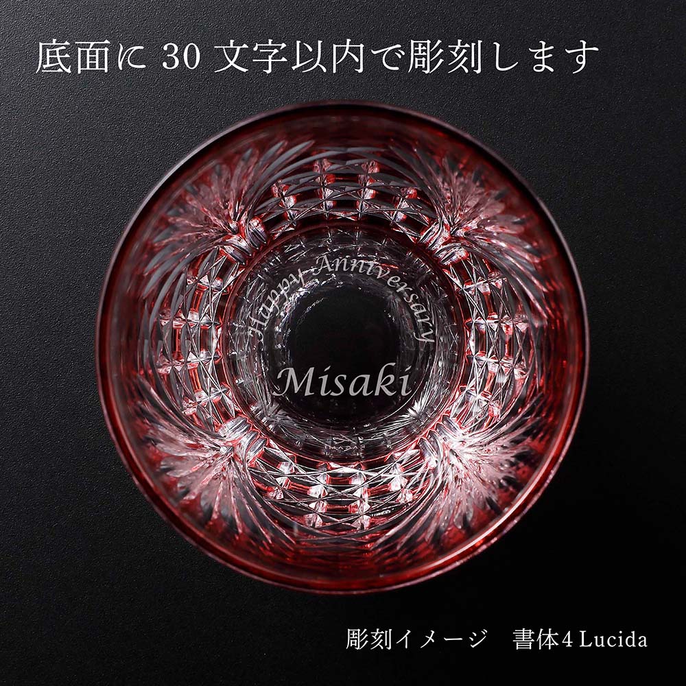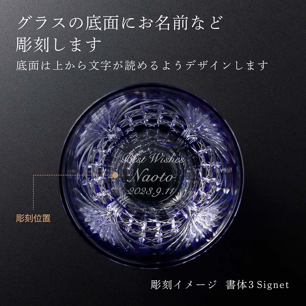●彫刻する内容はご注文フォームの備考欄にご入力ください。 ●通常ご注文いただいてから10営業日程度で発送いたしますが、デザインの修正などがある場合発送日が遅れる場合がございます。 ●お急ぎの際は可能な限り納期を早めて発送いたしますので、お気軽に当店までご相談ください。 ●実店舗・オンラインショップ等で同時に販売しているため、ご注文後に在庫がない場合も稀にございます。ご了承ください。 ●その他ご不明な点があればお気軽にお問合せください。 定休日:火曜日 お電話受付時間:10時から19時(土日祝は18時まで)KAGAMI カガミクリスタル 江戸切子 ペア ロックグラス 笹っ葉に四角籠目紋 に名入れ彫刻をしてお届けします。 【KAGAMI カガミクリスタルについて】 1934年創業の日本老舗クリスタルブランド「KAGAMI」。 日本で一つ一つ職人が丁寧につくっているグラスは、皇室や日本国大使館・首相官邸の正餐用としても用いられており、信頼と伝統が息づく逸品です。 美しく繊細なデザインのグラスは、大切な方へのお祝いにもおすすめです。 【江戸切子 ペア ロックグラス 笹っ葉に四角籠目紋について】 色被せガラスに「笹っ葉」と「四角籠目」の伝統的なカットを施した江戸切子のペアロックグラスです。 ブルーとレッドのグラスにカットがより美しく映えます。 クラシックなデザインの技術が光る逸品です。 ●サイズ:口径76mmx高さ90mm ●容量:240ml ●日本製 ●木箱入り 2個セット ●ラッピング無料(当店オリジナルラッピングでお届けします/紙袋なし) ※のし希望の場合は箱を包装紙でお包みし、のしを付けてお届けします。 ●彫刻する位置 【底面】30文字以内 彫刻する内容はご注文フォームの備考欄にご入力ください。 【ご注意ください】 ※商品画像の色はお使いのパソコンモニター・スマートフォンのカラーバランス等により、実物と若干異なる場合があります。 できる限り実物に近くなるよう努めていますが、上記の点ご考慮いただきご注文をお願い致します。 【ロゴ・イラストも彫刻対応可能です】 ロゴやイラストデータをご用意いただければ、彫刻対応いたします。 彫刻するためにデータ加工費が2,000円〜(税抜)かかります。 ※ご注文前にデータを当店で確認させていただき、加工費についてお見積もりをすることも可能です。 ※加工費はデータ1件に対してかかります。同じ内容を複数個彫刻ご希望の場合、個数分費用がかかるものではありません。 ※詳細は、ご注文前にお気軽に当店までお問い合わせください。 ■仕上がりデザイン画像確認の有無を選べるようになりました 当店では仕上がりデザイン画像を作成してお送りしていますが、確認なしで彫刻しても良いというお客様のために、「制作前イメージの確認必要」と「確認不要(すぐに制作)」と選んでいただくようにしました。 確認不要をお選びいただく場合は、ご注文後の修正は出来ませんのでご了承ください。 文字を彫刻するバランスや位置は当店にお任せください。(文字数によって角度や位置を調整します) 「確認必要」をお選びいただいた場合は、3営業日以内に当店より仕上がりデザイン画像をメールで送信いたしますので、必ずご確認いただき、修正がない場合もお返事をいただきますようお願いいたします。 デザインを送った後、5営業日以内にお返事がない場合はそのままの状態で彫刻・発送いたします。 彫刻するメッセージ・書体はこちらからお選びください。 ■書体一覧 ■メッセージ一覧