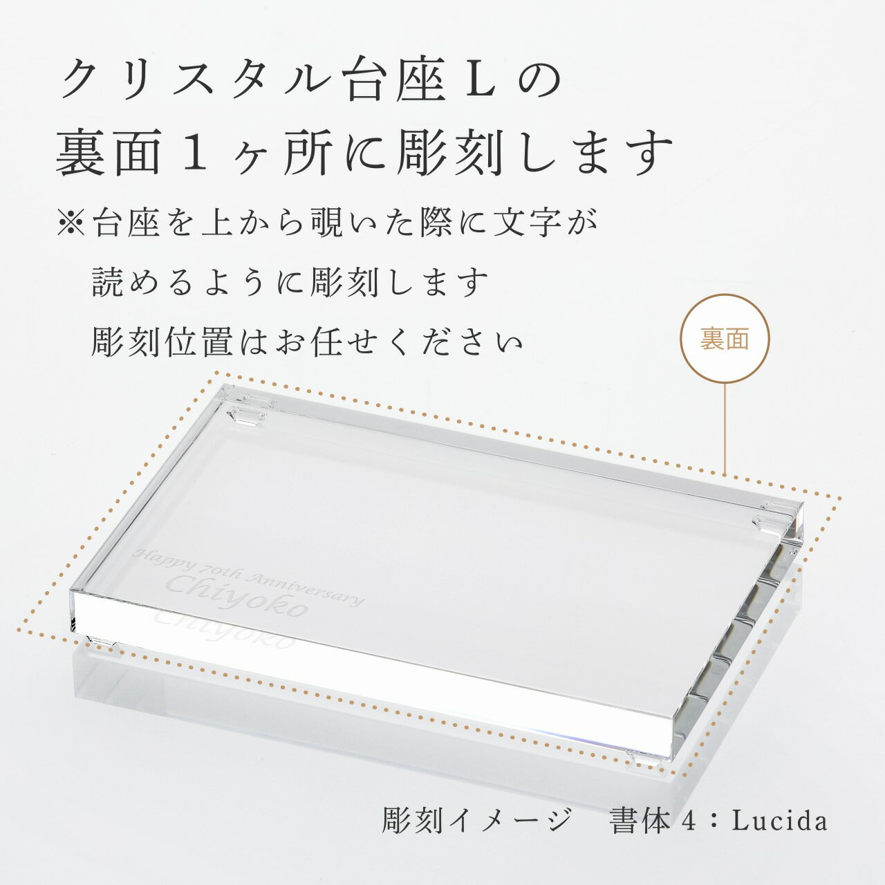 ●彫刻する内容はご注文フォームの備考欄にご入力ください。 ●通常ご注文いただいてから10営業日程度で発送いたしますが、デザインの修正などがある場合発送日が遅れる場合がございます。 ●お急ぎの際は可能な限り納期を早めて発送いたしますので、お気軽に当店までご相談ください。 ●実店舗・オンラインショップ等で同時に販売しているため、ご注文後に在庫がない場合も稀にございます。ご了承ください。 ●その他ご不明な点があればお気軽にお問合せください。 定休日:火曜日 お電話受付時間:10時から19時(土日祝は18時まで)バカラ 干支 ドラゴン・スワロフスキー 台座 Lサイズ オリジナルセットに名入れ彫刻してお届けします。新しい年を迎える清々しさを伝えるバカラの干支オーナメントに、2024年の干支である辰(ドラゴン)が加わりました。十二支の中で唯一架空の動物であるドラゴンは、中国や日本では神聖な生物として崇められ、新しい時代の到来を告げるものとされてきました。また、宝珠をしっかりと握る姿は、吉兆や繁栄のシンボルとして知られています。長年培ってきたバカラの美しいクリスタルでかたどられたこのオーナメントは、輝かしい年迎えにふさわしく、また晴れの日の贈り物などにも最適です。スワロフスキーのクリスタルプレートの台座Lサイズとのオリジナルセットにしてお届けします。●ドラゴン サイズ:高さ 9.30 cm 幅 5 cm 長さ 15.8 cm●design:Allison Hawkes●生産国:フランス●プレート サイズ:1.5 × 13.7 × 8.7 cm●ラッピング無料バカラとスワロフスキーは正規店より入荷しております。オブジェはバカラ正規ボックスとリボンでお包みし、台座はスワロフスキー正規ボックスにお入れします。バカラ正規紙袋と一緒にお届けいたします。(紙袋のサイズは選べません)※パッケージは予告なく変更される場合があります。※のし希望の場合は箱を赤い包装紙でお包みし、のしを付けてお届けします。●彫刻する位置【台座裏面】50文字程度まで一ヶ所に彫刻します※台座を上から覗いた際に文字が読めるよう彫刻します※細かな位置はお任せください彫刻する内容はご注文フォームの備考欄にご入力ください。●ご入力いただいた彫刻内容をそのまま彫刻します。入力間違えのないようお気をつけください。※お客様ご自身の入力ミスで彫刻内容が異なっていても返品・交換は出来ません。●大文字・小文字につきまして、特にご指示がない場合は「頭文字のみ大文字/他小文字」に修正いたします。※書体1、2、3、5、6、7、マグカップ書体Bをお選びの場合に限ります。「全て大文字で彫刻したい」「あえてこの綴りでお願いしたい」等ご希望がある場合はご要望欄にご記入ください。【ご注意ください】商品画像のお色に関しまして、お使いのパソコンモニター・スマートフォンのカラーバランス等により、実物と若干異なる場合がございます。できる限り実物に近くなるよう努めておりますが、上記もご考慮いただきご注文をお願い致します。【ロゴ・イラストも彫刻対応可能です】ロゴやイラストデータをご用意いただければ、彫刻対応いたします。彫刻するためにデータ加工費が2,000円〜(税抜)かかります。※ご注文前にデータを当店で確認させていただき、加工費についてお見積もりをすることも可能です。※加工費はデータ1件に対してかかります。同じ内容を複数個彫刻ご希望の場合、個数分費用がかかるものではありません。※詳細は、ご注文前にお気軽に当店までお問い合わせください。■仕上がりデザイン画像確認の有無を選べるようになりました当店では仕上がりデザイン画像を作成してお送りしていますが、確認なしで彫刻しても良いというお客様のために、「制作前イメージの確認必要」と「確認不要(すぐに制作)」と選んでいただくようにしました。確認不要をお選びいただく場合は、ご注文後の修正は出来ませんのでご了承ください。文字を彫刻するバランスや位置は当店にお任せください。(文字数によって角度や位置を調整します)「確認必要」をお選びいただいた場合は、3営業日以内に当店より仕上がりデザイン画像をメールで送信いたしますので、必ずご確認いただき、修正がない場合もお返事をいただきますようお願いいたします。デザインを送った後、5営業日以内にお返事がない場合はそのままの状態で彫刻・発送いたします。彫刻するメッセージ・書体はこちらからお選びください。■書体一覧■メッセージ一覧