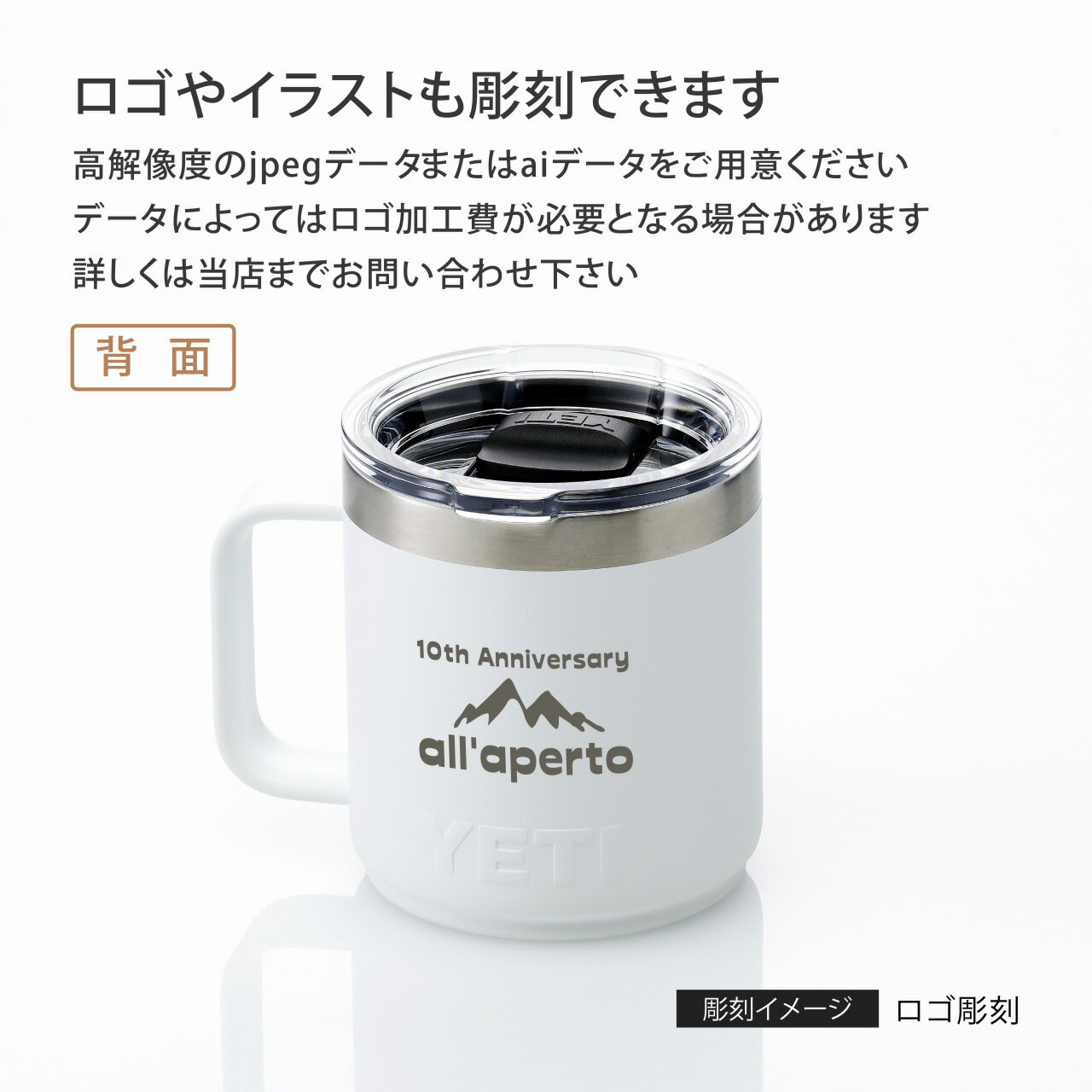 ●彫刻する内容はご注文フォームの備考欄にご入力ください。 ●通常ご注文いただいてから10営業日程度で発送いたしますが、デザインの修正などがある場合発送日が遅れる場合がございます。 ●お急ぎの際は可能な限り納期を早めて発送いたしますので、お気軽に当店までご相談ください。 ●実店舗・オンラインショップ等で同時に販売しているため、ご注文後に在庫がない場合も稀にございます。ご了承ください。 ●その他ご不明な点があればお気軽にお問合せください。 年中無休(年末年始など特別休業日あり) お電話受付時間:10時から18時まで【こちらは単品の商品です】 YETI イエティ ランブラー スタッカブル10ozマグに名入れ彫刻してお届けします。 バーベキューやキャンプからデスクワーク時・くつろぎの時間まで、シーンを問わずに大活躍する万能マグカップです。 ● 真空断熱とフタでしっかり温度キープ YETIならではの真空断熱構造にフタを付属し、ホットもコールドも長時間おいしい温度をキープ。 外側が熱くなりにくく、冷たい飲み物でも結露しにくいので、テーブルを濡らしません。 ●取り外し簡単なマグネットスライダー フタの飲み口にあるスライダーはマグネット仕様なのでカンタンに取り外しでき、しっかり洗浄可能。 ● 重ねて収納できるスタッカブル設計 スタッカブル(重ね収納)仕様 で、複数揃えてもスペースを取らず収納が快適。 キャンプギアや食器棚の中でもスッキリと整理できます。 ● 強度抜群のステンレスボディ 頑丈なステンレススチールに耐久性の高いコーティングを施し、アウトドアの過酷な環境でも長く愛用可能。 ● お手入れラクラクの食洗機対応 食洗機対応 なので、毎日の使用もストレスフリーです。 落ち着いた白色は、インテリアの邪魔をせず、キッチンにも自然と溶け込みます。 YETIの魅力を最も自然に楽しめる、定番の一本です。 アウトドア好きな方へ、お世話になってる方へ、感謝の気持ちを込めた贈り物にピッタリなアイテムです。 ●使用上の注意 ※液漏れ防止対応ではございません。 ※火気の近くにボトルを置かないでください。 ・サイズ:H9.7cm(蓋を含む高さ:10.3cm)×φ8.8cm(持手を含めた幅:11.7cm) ・容量:295ml ・重量:302g(蓋を含めた重量:367g) ●ラッピング無料 ボックスに入れ包装紙でお包みし、リボンを掛けてお届けいたします。 ※パッケージは予告なく変更される場合があります。 ※のし希望の場合は箱を包装紙でお包みし、のしを付けてお届けします。 ※こちらの商品には紙袋が付属しません。 『アッシュ.ギフト ハマ オリジナルショップバッグ』もご用意しております。 ●彫刻する位置 【正面】20文字程度まで 【背面】20文字程度まで いずれか一ヶ所に彫刻します 彫刻する内容はご注文フォームの備考欄にご入力ください。 ●ご入力いただいた彫刻内容をそのまま彫刻します。入力間違えのないようお気をつけください。 ※お客様ご自身の入力ミスで彫刻内容が異なっていても返品・交換は出来ません。 ●大文字・小文字につきまして、特にご指示がない場合は「頭文字のみ大文字/他小文字」に修正いたします。 ※レーザー書体L01、L04をお選びの場合に限ります。 「全て大文字で彫刻したい」「あえてこの綴りでお願いしたい」等ご希望がある場合はご要望欄にご記入ください。 【ご注意ください】 ※レーザーで焼くことによる彫刻のため、ススやヤニがどうしても出ます。 出来る限り取り除いてお送りいたしますが、彫刻部分が色の薄い服などに触れないようご注意ください。 ※商品画像の色はお使いのパソコンモニター・スマートフォンのカラーバランス等により、実物と若干異なる場合があります。 できる限り実物に近くなるよう努めていますが、上記の点ご考慮いただきご注文をお願い致します。 【ロゴ・イラストも彫刻対応可能です】 ロゴデータはお客様でJPEG画像またはAIデータ(ベクターデータ)をご用意いただければ加工費はかかりません。 ※複雑なロゴやその他条件により加工費2,000円〜(税抜)がかかる場合もございます。 ※ご注文前にデータを当店で確認させていただき、加工費についてお見積もりをすることも可能です。 ※加工費はデータ1件に対してかかります。同じ内容を複数個彫刻ご希望の場合、個数分費用がかかるものではありません。 ※詳細は、ご注文前にお気軽に当店までお問い合わせください。