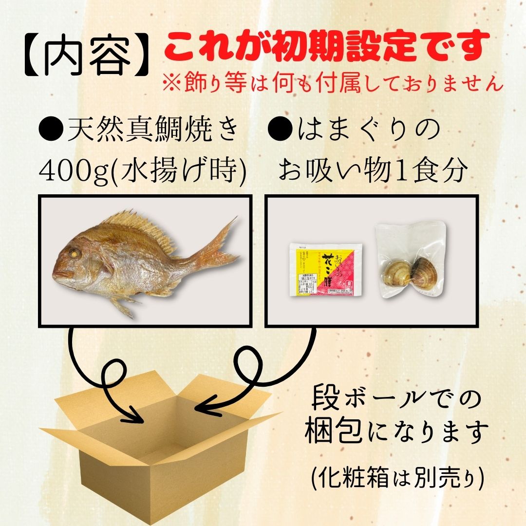 商品詳細 内容量/賞味期限 ・ 祝い鯛 約400g(約27cm)/冷蔵:発送日含め4日 冷凍:約1ヶ月 真鯛の重さは水揚げ後の重さの表記となっています。 焼き上がりの重さとは異なります。 ・はまぐり吸い物1食分 /約半年 詳しくは商品に記載 産地名 鯛:山形県海域、その他 はまぐり:中国産を国内で加工 養殖・解凍 天然 消費期限 お早めにお召し上がりください。 保存方法 冷蔵・冷凍 支払い方法 お支払いは、銀行振込・代金引換・クレジット決済・楽天バンク決済がご利用いただけます。 銀行振込の方は、ご注文確定後5日以内にお振込ください。 梱 包 全ての商品、無料でのし対応いたします。 お歳暮・お中元・お祝いなどにお使いください。 短冊型ののしを箱外部に 貼るかたちとなります。 配 送 ヤマト運輸でお届けします。 注文日より2?3日以降から着日指定可能です。時間指定もできます。 北海道・四国・九州・沖縄は、翌々日の到着となりますのでご注意ください。 注文確定後(前払いは入金確認後)、正午までのご注文は、当日発送いたします。万が一ご出荷が遅れる場合は メールでご連絡致します。 休業日(日祝)は発送できませんのでご了承ください。 ご注文後、自動受注メールを送信しております。届かない場合は、当店までご連絡ください。 返 品 ●返品を受け付ける条件 不良品は、商品ご到着後24時間以内に電話連絡いただいたもののみお受けいたします。 生鮮食品のため、お客様のご都合による返品はお受けすることができませんので、予めご了承ください。 ●返品の送料・手数料の負担について 当社が負担いたします。 ●返金・交換について 返品商品到着確認後5日以内にご指定口座にお振込いたします。 当店の在庫状況を確認のうえ、新品または同等品と交換させていただきます。 ●返品連絡先 電話番号:0235-43-3145 090-5842-0737 メールアドレス:auc-hasegawasengyo@shop.rakuten.co.jp 返送先住所:山形県鶴岡市湯温海字湯の尻543 担当者 :長谷川光枝 加工業者 山形県鶴岡市湯温海字湯の尻543 有限会社 出羽鮮魚 営業時間 ネットでのご注文は24時間受け付けております。 お電話でのお問合せは、担当(長谷川光枝)まで、下記の時間帯にお願いします。 電話番号:0235-43-3145 090-5842-0737平日 9:00〜18:00 土 9:00〜18:00 ※日祝祭日はお休みをいただいております。 メールの返信は翌営業日となりますので、ご了承ください。自分好みに組み合わせ 『カスタムセット』 お食い初めやお正月など、お祝い事に欠かせない鯛の塩焼き。 当店でも様々な組み合わせで祝い鯛のセットを販売しております。 その中で、もっとお客様ひとりひとりのニーズにお応えしたい…!という思いからこの「カスタムセット」ができました。 初期設定を最低限にし、お客様から必要なものだけ追加していただくという形を実現! みなさんもぜひ自分好みにカスタマイズしてみて下さいね♪ ※鯛の重さは水揚げ後の重さの表記となっております。 焼き上がりの重さとは異なります。 ※初期設定に鯛飾りは付属しておりませんのでご注意ください。 【150円】かわいい100日ポストカードはこちら ★レビューを書いていただくだけで次回からのお買い物(3000円以上)でお使いいただける500円分のクーポンを発行いたします。 ※レビューを書くを選択されたお客様は到着後1週間以内にレビューをお書きください。 そしてさらに!!! ★写真を送ってくださるお客様には500円クーポンを追加でお送りいたします。 素敵なお写真をレビューに添付またはメールでお送りください。 ※送っていただきましたお写真は当店のSNSやホームページ等に掲載させていただきます。 誠に勝手ながら、日曜・祝日は祝日は定休日とさせていただいております。 発送・電話やメール等の対応は翌営業日からとなります。 何卒ご了承のほどよろしくお願いいたします。