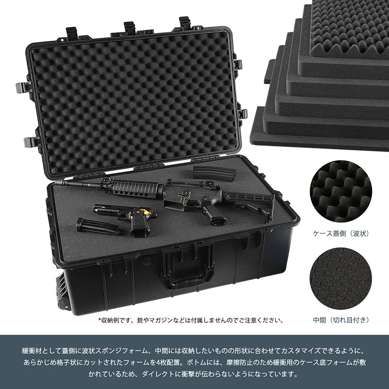 1,000円以下の商品を見る 2,000円以下の商品を見る 3,000円以下の商品を見る 4,000円以下の商品を見る 5,000円以下の商品を見る 6,000円以下の商品を見る商品詳細 【商品概要】 グラスファイバーにより強化されたポリプロピレンをボディの材質に採用した耐圧・耐衝撃性に優れた頑丈なハードケース。 エアガン以外のアイテムでも大切に扱いたい、ソフトタイプのケースでは不安という方にはお勧めです! 内部の蓋側には波状スポンジフォーム、もう一方には、あらかじめ格子状の切れ目が入ったフラットスポンジが3枚敷き詰められています。 内容物の形状に合わせカットすることで整然と収納することができます。ボトムには、摩擦防止のため緩衝用のケース底フォームが敷かれているため、ダイレクトに衝撃が伝わらないようになっています。 容量が大きく、小型〜大型のエアガンはもちろん、ドローンやダイビング機材など大型なものの収納も安心です! 表面には微細な滑り止めの凹凸が設けられているので、耐摩耗性にも優れ、いくつかのケースを積み重ねても、傷がつきにくくなっています。 【安全性抜群】 このハードケースは、HTGベーシック(H.T.G.Basic)の標準モデル「Standard」シリーズに属します。 安心に運べるハードケースで、頑丈でしっかりとした作り。 シェルの素材にはグラスファイバーで強化されたポリプロピレンを採用し、内部には多層スポンジが敷き詰められているため、内容物をあらゆる角度から保護します。 耐圧・耐衝撃・防水・防塵性能に優れ、屋外での持ち運びでもしっかりと守る頼もしいケース。内容物を大切に扱いたい、ソフトタイプのケースでは不安という方にはお勧めです。 【多層スポンジ】 緩衝材として蓋側に波状スポンジフォーム、中間には収納したいものの形状に合わせてカスタマイズできるように、あらかじめ格子状にカットされたフォームを4枚配置。 ボトムには、摩擦防止のため緩衝用のケース底フォームが敷かれているため、ダイレクトに衝撃が伝わらないようになっています。 【様々なシーンで使用可能】 ハンドガン〜中型サイズのライフル(2丁収納可能)やマガジンなどのほか、ドローン、ダイビング機材や電子機器などの収納も可能です。 ハードガンケースならではの頑丈な保護で安心に保管できます。 【細部の便利な機能】 ケース横には鍵をかけることが可能なロックホールが搭載されており、防犯面においても安心です。 また、空輸などの際に生じる圧力差を調節するリリースバルブを搭載。 移動に便利なキャスター付きで、通常の取っ手に加え、伸縮可能なキャリングハンドルも搭載しているため、快適に持ち運ぶことができます。 【仕様】 材質:ポリプロピレン+グラスファイバー /外寸:約79.7cm×51.8cm×31.3cm /内寸(スポンジ含まず):約73.7cm×45.7cm×27.3cm /深さ:約4.7cm/22.6cm(上下) /重量:約11.5kg /付属品: 波状スポンジフォーム×1 フラットスポンジフォーム×5 ※保護スポンジは手作業でも型抜きしやすいように、切れ目が入っておりますが、手で切り取れない場合は、ハサミやカッターを用いてカットするようにしてください。 【※ご注意】 ※スポンジやプラスチックの独特の匂いがわずかにあるため、風通しの良い場所にしばらく置いてからご使用をお勧めいたします。 ※保護スポンジは手作業でも型抜きしやすいように、切れ目が入っておりますが、手で切り取れない場合は、ハサミやカッターを用いてカットするようにしてください。 ※海外製品のため、運輸によって生じる細かいキズがある場合あります。当店では商品発送前に検品を行っておりますが。万が一、不良品がお手元に届きましたらご連絡ください。速やかに返品・交換対応をさせていただきます。