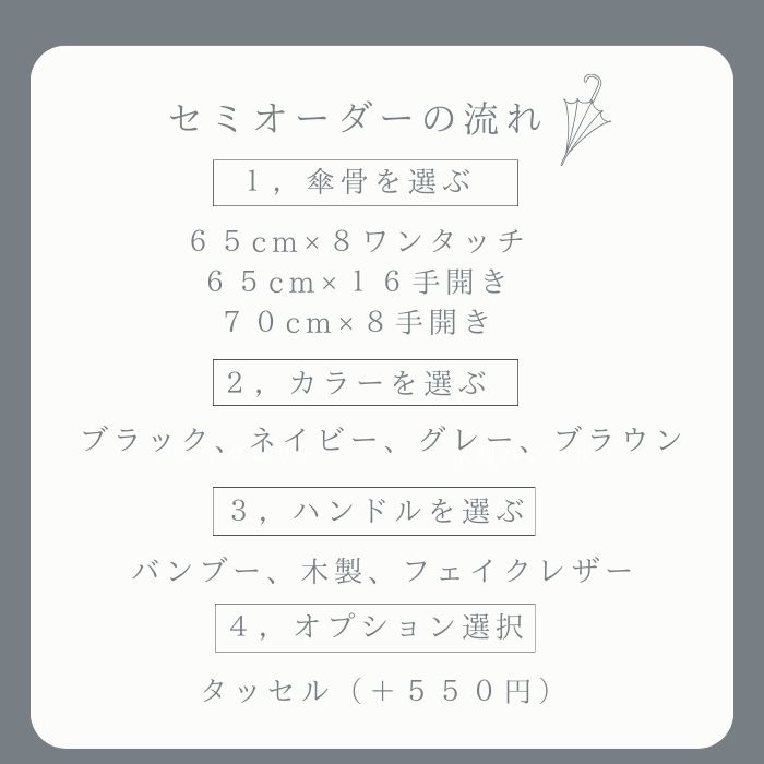 CLASSICO 「スーツに似合う、大人のセミオーダー傘」 傘専門店でつくる、選んで仕立てるセミオーダー傘 傘骨 × カラー × ハンドル × タッセル 4ステップで簡単オーダー! 贈り物にもおすすめ 【傘骨】 65cm×8本 ワンタッチ ・ボタンひとつでスムーズに開くジャンプタイプ ・通勤・通学など毎日使いに便利 ・ほどよい大きさで扱いやすい 65cm×16本 手開き ・美しい放射状のシルエットが魅力 ・骨数が多いため強度が高く、風に強い設計 ・和傘を思わせる上品な印象で、フォーマルにもおすすめ 70cm×8本 手開き ・大判サイズで体をしっかりカバー ・雨の日も安心のゆとりあるサイズ感 【生地カラー】 ・ブラック 定番で合わせやすく、スーツにもカジュアルにも馴染む万能カラー ・ネイビー 知的で爽やかな印象。ビジネスシーンにも好印象 ・グレー 落ち着いた雰囲気で、幅広い年代に人気 ・ブラウン 柔らかく温かみのある色合い。大人の落ち着きを感じさせます 【ハンドル】 バンブーハンドル ・手に馴染む質感と、持つだけで漂う高級感 ・自然素材ならではの風合いが、大人の品格を引き立てます 木製ハンドル ・強度と耐久性に優れた合板を使用したハンドル ・反りや割れが少なく、日常使いでも安心してお使いいただけます ・シンプルなデザインで、どんなシーンにも馴染みます フェイクレザーハンドル ・高品質なフェイクレザーを使用したハンドル ・本革のような上品な風合いがありながら、水や汚れに強く、日常使いに最適です ・スマートな印象で、ビジネスにもカジュアルにもよく似合います 【オプション】 傘に上品なアクセントを添えるタッセル 高級感ある仕上がりで、大切な方へのギフトにも最適です セミオーダーのタッセルをオプションでお選びいただいた場合 傘ハンドルの保護ビニールを取り外してタッセルをお取り付けいたします あらかじめご理解くださいますようお願い申し上げます 【グラスファイバー骨】 親骨には釣竿などにも使用される強度の高いグラスファイバーを使用していますグラスファイバーは軽量で弾力性があるので強風でも折れ曲がってしまう事はありません 【中棒】 頑丈なアルミ製になります 【生地】 肉厚でしっかりしていてシワになりにくい、ポリエステル生地を使用しています 【大判】 開いたサイズ:65cm→直径110cm。70cm→120cm 【袋付き】 袋付きで、傘を閉じてもシックでお洒落な雰囲気です 【日本洋傘振興協議会JUPA】 厳しい基準に合格しており、安心してお使い頂けます ギフト +500円(税別)にてギフト対応しております。ご希望の方のみメッセージカードをお付けする事も可能です。詳しくはこちらをご覧下さい。 配送 配送について詳しくはこちらをご覧下さい。 注意 ※画面の商品と実物では、モニターなどにより多少色が違って見える場合がありますのでご了承ください。※思ったより大きい・小さい・重い などある場合がございますので、必ずサイズをご確認ください。「スーツに似合う、大人のセミオーダー傘」 傘専門店でつくる、選んで仕立てるセミオーダー傘 傘骨 × カラー × ハンドル × タッセル 4ステップで簡単オーダー! 贈り物にもおすすめです! 送料無料 クラシコ メンズ 雨傘 セミオーダー 選べる8本 16本 65cm 70cm 選べるカラー 選べるハンドル タッセル可 ギフト可 高級紳士傘 長傘 ◇ ◇ # 引出物 結婚祝い 引越しの挨拶 香典返し 御見舞 全快祝い 入学祝い 入園内祝い 初節句 粗品 記念品 二次会 景品 周年記念 還暦祝い ご挨拶 バレンタイン ホワイトデー 卒園 卒業 入学 母の日 梅雨 父の日 敬老の日 クリスマス ギフトプレゼント 贈答品 お返し お祝い 出産祝い 長寿 就職祝い 記念日 成人 お見舞い 傘寿 七五三 還暦祝い 栄転祝い 開店祝い 新築祝い 手土産 謝礼 昇進祝い 内祝い 送料無料