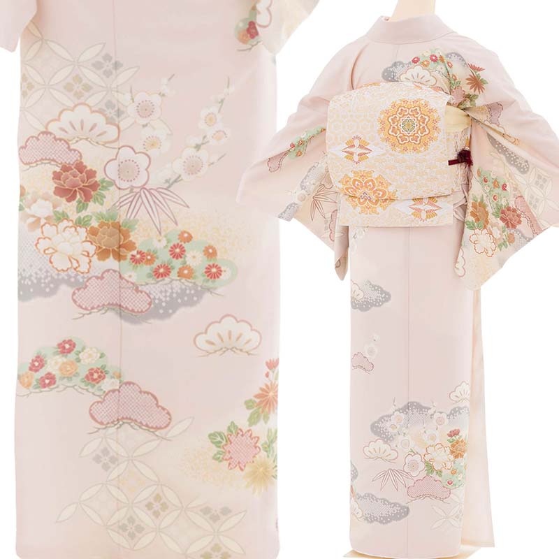 【レンタル】訪問着 レンタル 七五三 母 卒業式 入学式 お宮参り「Sサイズ」ピンク グレー 松竹梅 七宝 牡丹 フルセット ワンタッチ 簡単 (2496a)