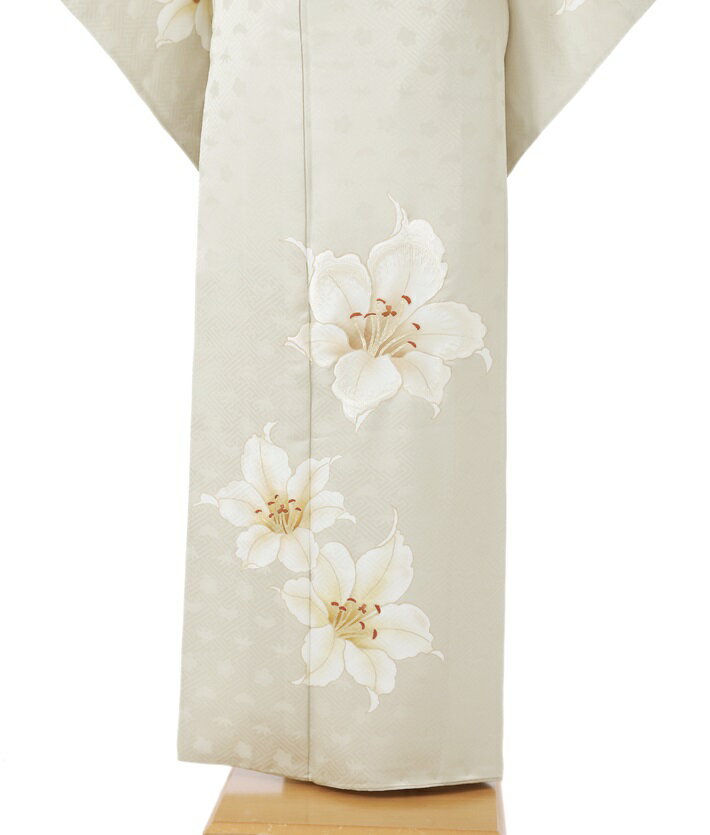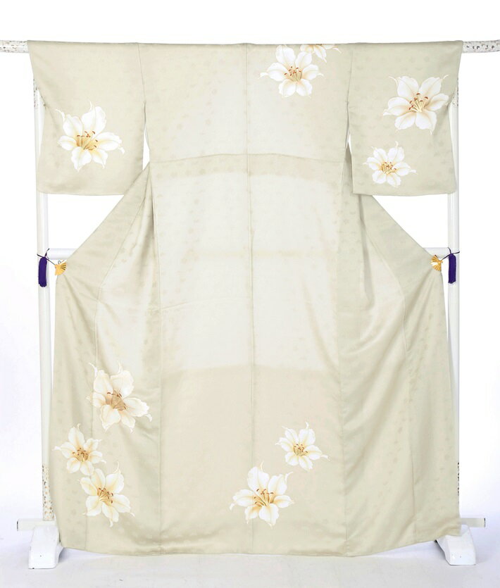 【レンタル】 訪問着 レンタル 正絹訪問着レンタルフルセット8AD494 レンタル訪問着 正絹 お呼ばれレンタル くすみ ライトベージュ 百合 150cm~170cm位まで 足袋プレゼント