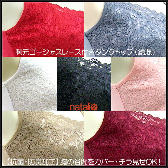 ベア天竺 インナー タンクトップ レース 綿95% 胸元レースデザイン M/L/LL/3L 白/黒/赤/ピンク/ベージュ/ブルー 大きいサイズ3L寸まで 肌触り快適商品 ナノプラチナ 抗菌・防臭 2WAY(ベア天竺) 【メール便可2】