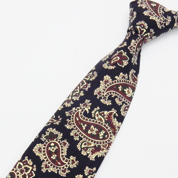 KYOTO●VINTAGE by England 英国マックルズフィールド郊外で50年以上に及び ラグジュアリーテキスタイル生産をリードしてきた歴史を持つ アダムリー社の伝統的なハンドプリントの生地を使用したネクタイです 商品詳細 内容 プリント シルクタイ 色 濃紺×ワイン×オフホワイト×深緑 柄 ペイズリー 素材 シルク100% サイズ 大剣幅約8cm 小剣幅約4cm 長さ約144cm 仕様 小剣通し(共生地) 日本縫製 all kyoto made