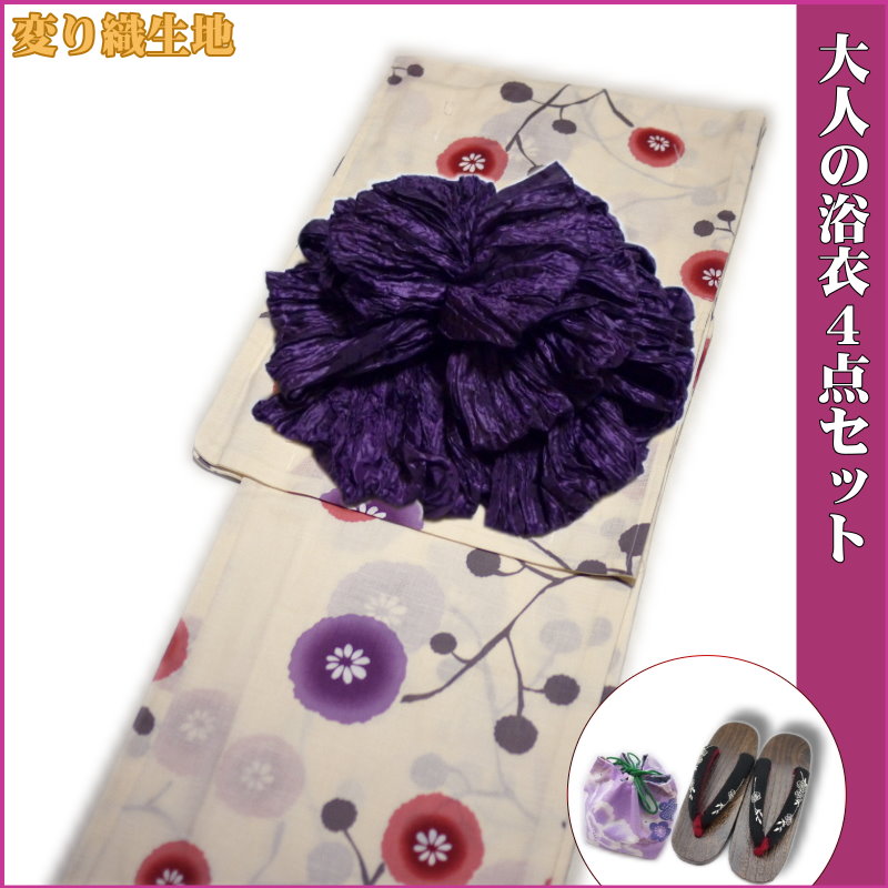 浴衣 4点セット レディース 高級変り織(クリーム色系)浴衣/帯/下駄/巾着 レディース 女性 和装 デート お祭り 夏祭り 花火 浴衣で万博