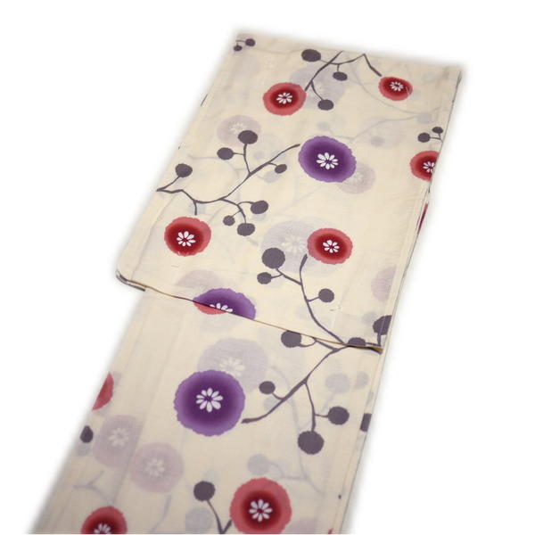 素敵な浴衣・帯・下駄・巾着の4点セット。 浴衣と帯は画像の商品となりますが、下駄・巾着はイメージ写真となります。 当店で浴衣に合わせてコーディネートしてお届けいたしますので楽しみにお待ちください! ●浴衣 凹凸のある変り織高級生地を使用した浴衣です。 【色 柄】クリーム色地に紫と赤の花柄。 【サイズ】フリー 身丈 165cm 裄69cm 袖丈49cm 適応身長:152cm〜167cm 【素 材】綿100% ●帯(在庫があれば他のお色に変更可能) シワ加工した軽くてふわふわとした可愛い大人用の浴衣用兵児帯です。 シワ加工により薄くてボリュームがあります。 長さもありますので色々なアレンジが楽しめます。 【色】グレープ色 【サイズ】長さ:約4メートル以上 巾:約40センチ(平置きの状態で計測。シワ加工なのでかなり伸びます。) 【素 材】ポリエステル100% 帯がうまく結べない方でも「サザメ」という器具を使うと簡単に色々な種類の帯が綺麗に結べます。 また、これを使うと背中にピッタリと張り付いてくれるます。 ●下駄鼻緒がやわらかいので、これなら初めて下駄を履く方でも足が痛くなりにくいと思います。滑りにくいように裏は全てゴムがはってあります。鼻緒の調節可能 【サイズ】フリー 23.5cm〜24.5cm。(実寸24cm)かかとの高さ:約3.5cm 【素 材】素材:桐(木製) ●巾着 可愛い和柄。 【素 材】綿100%