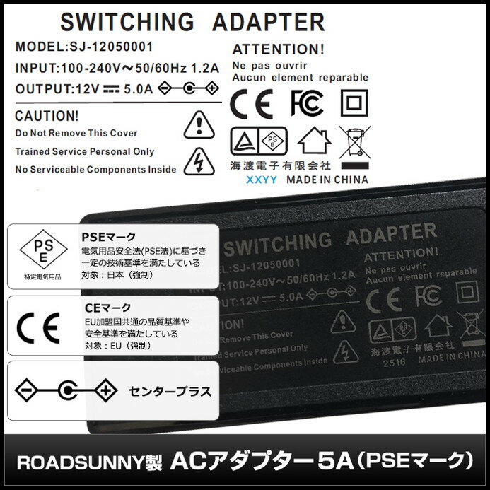 数量別価格 まとめ買いでさらにお得! 数量 金額 1個あたりの金額 1個 1,800円 (1,800円) 100個 169,000円 (1,690円) 500個 735,000円 (1,470円) 1000個 1,350,000円 (1,350円) 商品詳細 同梱物・セット内容 品名 数量 ACアダプター 汎用電源 12V 5A 60W 5.5mm 2.1mm PSE認証 1年保証 1個 外形寸法 サイズ:約120.0×54.5×34.0mm(奥行/幅/高さ) ケーブル長(出力):約1.5m メガネケーブル長(入力):約1.8m DCジャック外径:5.5mmφ DCジャック内径:2.1mmφ 仕様 分類:スイッチングACアダプター 型番:SJ-12050001 出力電圧:12V 出力電流:5A 消費電力:60W メーカー:ROADSUNNY(ロードサニー) 入力端子:差込プラグ 出力端子:DCジャック ジャックタイプ:ストレート 定格入力電圧:AC100~240V 入力周波数:50/60Hz 極性:センタープラス DCコード規格:AWG20/300V/80℃ 重量(本体):約223g パイロットランプ:赤 保証:商品到着後、1年間の品質保証が付いております。 万が一品質に問題があった場合は、メールにてご連絡ください。 特定電気用品:PSE(PSEとは?) フルスペル:Product + Safety + Electrical appliance & materials フルスペル:製品+安全+家電・素材 読み方:ピーエスイー PSEとは、2001年に施行された「電気用品安全法」の通称、および、同法に基づき電気製品が所定の安全基準を満たしていることを示するため付与されるマークの通称。 ... PSEマークは、所定の適合性検査、技術基準への準拠、ないしは事業の届出といった義務が履行されたことを示す。 RoHS対応(RoHSとは?) “Directive on the Restriction of the use Of certain Hazardous Substances in electrical and electronic equipment"のことで、電子・電気機器における特定有害物質の使用制限に関する欧州連合(EU)の指令(2002/95/EC, 2011/65/EU, (EU)2015/863)です。 制限対象となる特定有害物質は、カドミウム、鉛、水銀、六価クロム、ポリ臭化ビフェニル類(PBBs)、ポリ臭化ジフェニルエーテル類(PBDEs)、フタル酸ビス (2-エチルヘキシル)(DEHP)、フタル酸ブチルベンジル (BBP)、フタル酸ジブチル (DBP) 、フタル酸ジイソブチル (DIBP)の10物質群であり、本指令によって電子・電気機器に使用される材料への含有濃度は制限されております。 注意事項 その他の電圧、規格の製品にはご使用になれません。 他社製品との互換性に関してはお答えしておりません。 保証期間内でも、容量過多、電圧の違いによる不具合に関しては保証対象外となります。 必ずお使いの機器の「電圧(V)」「電流値(A)」をお確かめの上ご購入ください。 1年保証の適用条件は通常保証と同等になります。 ご質問はjapan@kaitodenshi.jpまで、お気軽にお問い合わせください。 ACアダプターのDCジャックを『5.5-2.5mm』で使用したい場合 PSEマーク付き アダプター PSEアダプター 5V PSEアダプター 9V PSEアダプター 12VPSEアダプター 18VPSEアダプター 24V おすすめオプション 7428 7438 7567 7548 ノイズフィルター オンオフスイッチ アダプター関連オプション ジョイントケーブル系 ケーブルコネクタ系 防水ケーブル PSEアダプターに便利な付属品をセットに プラグセット各種 わに口クリップセット
