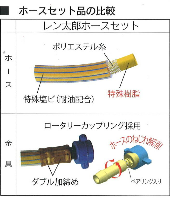 【商品詳細】 安全性を徹底追及。ホース、金具の耐久性をより向上!! ◇30mレン太郎ホースセット 着脱式◇ (1) 軽く、疲れを感じさせない柔らかさ ゴムホースと比べ約40%軽く、片手でも楽に持てます。 −10℃の作業環境でもOKです。 (2) 耐久性抜群の強さ 屈曲疲労に強く、一般塩ビホースに比べ約2倍以上の耐久性があります。 (3) 安全性を追求した金具 金具セット品はカシメやバンド一体型カップリングを採用し、 より安全性を向上させました。 両端ロータリーカップリング付 【装着可能機種】 PDS75S-5C1 PDS75SC-5C1PDS100S-5C1 PDS100SC-5C1 PDS130S-5C3 PDS130SC-5C3PDS175S-5C3 PDS175SC-5C3PDSF100S-5C3 PDSF100SC-5C3PDSF140S-5C3 PDSF140SC-5C3※不明点は、お問い合わせ下さい。 ■他の長さもございますのでご覧下さい! ※仕様は予告なく変更になることがございます。 ※下記注意事項の確認をお願いいたします。 発送詳細 入金確認後2日以内(土・日・祝祭日除く)に商品を発送致します。 また、基本的に商品配達日の日時・時間指定はできませんのでご了承下さい。 こちらの商品は、弊社に常時在庫ございますので 入金確認後発送の手配をさせていただきます。 ※混載便(ウイング車)での発送になります。 ※北海道・沖縄・離島等は別途送料がかかる場合がありますのでお問い合わせ下さい。 注意事項 ■返品について 異なる商品や、不良品がお手元に届いた場合は、商品到着後7日以内に弊社にご連絡下さい。新しい商品と交換させて頂きます。 前項に規定するほか、商品受領後の返品は一切お受けできませんのでご了承下さい。 日曜・祝日は質問・メール等の対応が出来ませんので御了承下さい。 その他の詳細はストアー情報をご覧下さい。