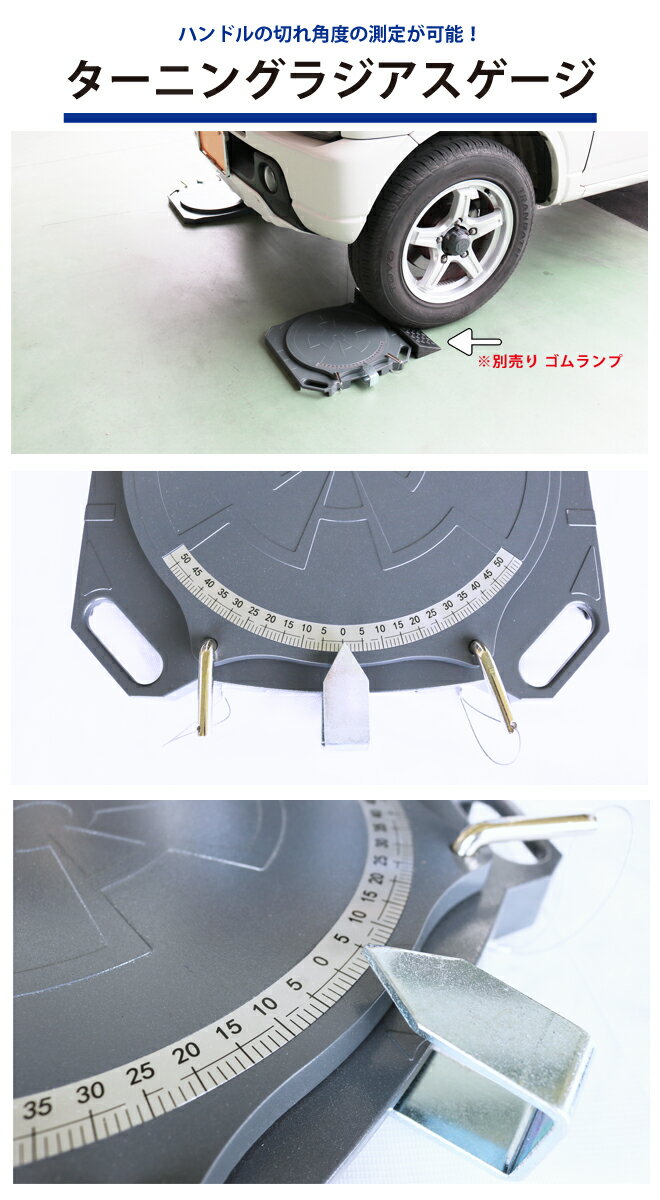 仕様・状態 本体重量 5.5kg(1個) 耐荷重 2000kg(2個合計) 輪重1000kgまで 切れ角 50度 梱包重量 12.0kg(セット合計) 商品説明 ハンドルの切れ角度を測定できます! ●左右2個セットのターニングラジアスゲージです ●ハンドルの切れ角度の測定が可能です ●アルミ製なのでとても軽量で、持ち運びや作業がとても楽です ●プレートは360度、及び前後左右自在に動きます ・前後に30mm(計60mm) ・左右に30mm(計60mm) ●認証工具としてお使いいただけます ★ターニングラジアスゲージ専用ゴムランプはこちら(別売り) 別途送料について ★沖縄は別途送料1,000円を申し受けます ☆上記以外の地域は送料無料です