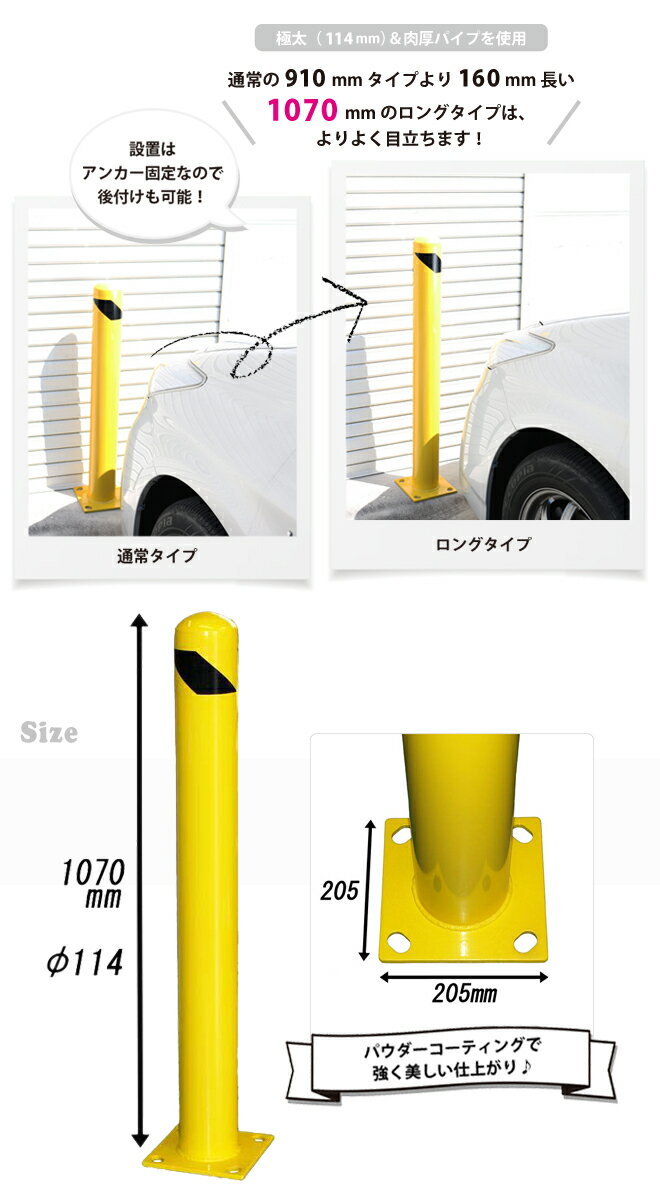 仕様・状態 本体重量 10.2kg(鉄製) パイプの肉厚 2.5mm プレートの厚み 10mm パイプ太さ 114mm 穴のサイズ 30×22mm 取り付け穴ピッチ 155mm 商品説明 超極太なのでよく目立ちます! ●車止めポール 直立型のロングタイプです ●塗装はパウダーコーティングなので、強く美しい仕上がりのガードパイプです ●パイプは114mmと極太で肉厚パイプを使用しておりますので強力です ●設置はアンカー固定なので後付けも可能です ●画像の黒い模様はシールなので不要の場合は剥がしてご使用ください 設置はアンカー固定なので後付けも可能です ※取り付けボルトは付属しておりません ※外見保証はございません 新品ですが、輸入・工業製品のため、当たり傷等がある場合がございます タッチアップ補修痕がある場合、予めご了承ください 【CAD図面】 【 関 連 商 品 】 ★車止めポール 直立型 タイプ(高さ) ページ 直立型 910mm ● 直立型(ロング)1070mm ● 直立型(超ロング)1505mm ● ★ パイプガード横型はこちら 別途送料についてご案内 法人あては送料無料です (※但し北海道・沖縄・離島地域は送料別途かかります) 【法人別途送料】(1個につき) ★北海道1,000円 ☆沖縄1,500円 【個人配達別途送料】(1個につき) ★北海道・沖縄以外800円 ☆北海道:1,800円 ☆沖縄:2,300円