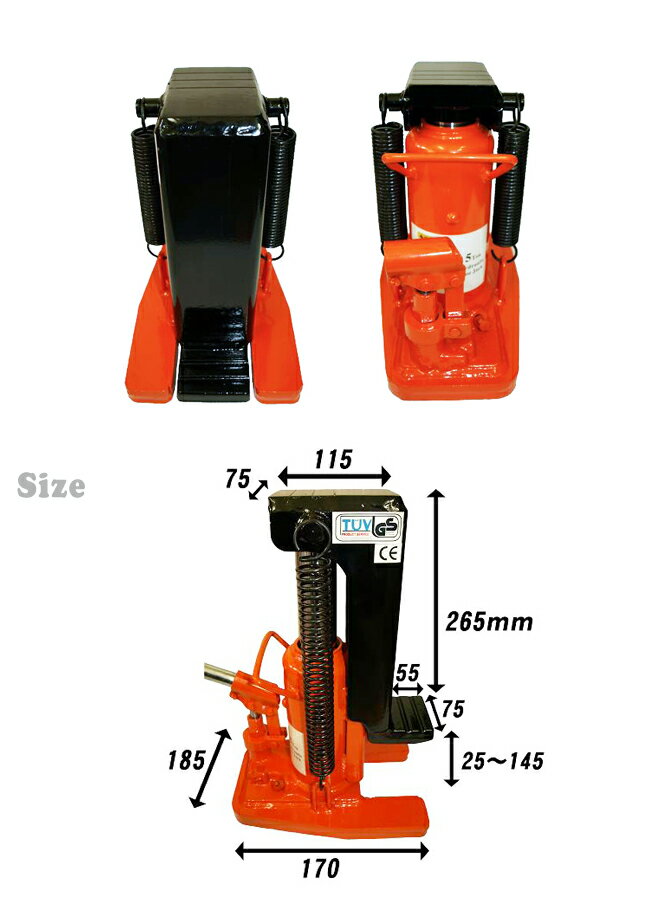 仕様・状態 本体重量 21.8kg 能力 爪部5トン・頭部 6トン 爪サイズ 55mm×75mm 最低/最高爪高さ 25〜145mm 梱包箱サイズ 230x325x320(mm) 商品説明 爪能力5トンで余裕の油圧パワー・強固/強靭ボデー! ●リターンスプリングの採用で無負荷でも楽々自然降下 ●スイベル式プランジャーはポンプアクション位置を自由に変えられ(180度旋回可能)狭い場所での作業に威力を発揮 ●セーフティバルブ付きで能力以上の荷重がかかる事が無くジャッキの破損を防ぐ安全設計 ●ドイツ工業製品品質規格TUV・GS取得 ●PL保険付 保証期間:6ヶ月 使用状況によっては保証対象外となる場合がございますので返送前に 必ずお問い合わせください (保証対象:油圧系統にかぎります) (保証対象外:(例)ダメージやオーバーロードによる変形・ゆがみ等、使用による車輪の摩耗・水、塩分に起因する故障 ) 保証期間内の返送運賃はお客様負担でお願いいたします お客様によるイメージ違いでの返品は一切お受け出来ませんので予めご注意ください 【 ご 注 意 】 ※横倒しでの使用はできません ※傾いた斜面でのご使用はできません ※砂利や土の軟弱な地面ではご使用できません ※保管する時も必ず縦向きで保管してください 横向きにすると油漏れする可能性があります ※バルブは外さないでください(スチールボールが飛び出る可能性があります) ※手や足で負荷をかけてジャッキダウンしてください 別途送料について ★沖縄:1,000円 ☆北海道:500円 ★上記以外の地域は送料無料です