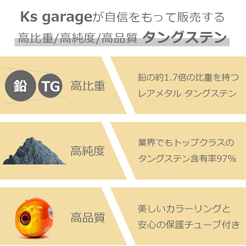 こちらのページは、【タングステン タイラバ ヘッド 60g 80g 100g 3個セット (オレンジゴールド / レッドゴールド) 選べる2色】の商品ページです。 ■鯛釣り(タイラバ釣り)に使用する保護チューブ装着済のタングステンヘッド 60g 80g 100g 3個セットです。 ■市販のラバー付きのフックを装着すれば、簡単にタイラバの完成です。 ■保護チューブは装着済ですので、面倒な取り付け手間がありません。 ◆タングステンは通常の鉛と比べ、体積が60%ほどしかありませんのでシルエットを小さくする事が出来ます。 これにより ・着底スピードの向上 ・食い渋りに有効 ・余計な潮流の抵抗を受けない ・引き重り感の軽減 ・着底回数が増えるのでチャンスUP など様々な利点があります。 ※タングステン97% 鉄3%で成型されています※ ・品番:TNG-60g-80g-100g-color-kit ・重量:60g/80g/100g ・チューブ内径:約2.5mm ・含有率 タングステン97%:鉄3% タイラバ用タングステンヘッド tng-45g(45g 1個) tng-45g-set(45g 5個) tng-60g(60g 1個) tng-60g-set(60g 5個) tng-80g(80g 1個) tng-80g-set(80g 5個) tng-100g(100g 1個) tng-100g-set(100g 5個) tng-120g(120g 1個) tng-120g-set(120g 5個) tng-160g(160g 1個) tng-160g-set(160g 5個) tng-200g(200g 1個) tng-200g-set(200g 5個) tng-240g(240g 1個) tng-240g-set(240g 5個) tng-300g(300g 1個) tng-300g-set(300g 3個) tng-500g(500g 1個) tng-500g-set(500g 3個) タイラバ用タングステンヘッド ≪ホロカラー≫ タングステン ホロカラー(60g 1個) タングステン ホロカラー(80g 1個) タングステン ホロカラー(100g 1個) タングステン ホロカラー(120g 1個) タングステン ホロカラー(160g 1個) タングステン ホロカラー(60g 2色セット) タングステン ホロカラー(80g 2色セット) タングステン ホロカラー(100g 2色セット) タングステン ホロカラー(120g 2色セット) タングステン ホロカラー(160g 2色セット) タングステンヘッド 3WEIGHT set タングステン無垢 45g/60g/80g セット タングステン無垢 60g/80g/100g セット タングステン無垢 80g/100g/120g セット タングステン無垢 120g/160g/200g セット タングステン無垢 160g/200g/240g セット タングステン無垢 45g-240g 8種セット タングステン無垢 全10種コンプリートセット タングステンカラー 60g/80g/100g セット タングステンカラー 80g/100g/120g セット タングステンカラー 100g/120g/160g セット タイラバ用 交換鉛ヘッド namari-ball-90g(90g 無地) namari-ball-90g-set(90g 無地 5個) tairaba-ball-90g(90g 各4色) tairaba-ball-90g(90g 各4色 5個) tairaba-ball-115g(115g 各4色) tairaba-ball-115g-set(115g 各4色 5個) tairaba-fukaba350g (深場用) 釣り針・ネクタイ 俺の太仕掛け(各3色 5本セット) 交換用ネクタイ(全5色 3枚セット)