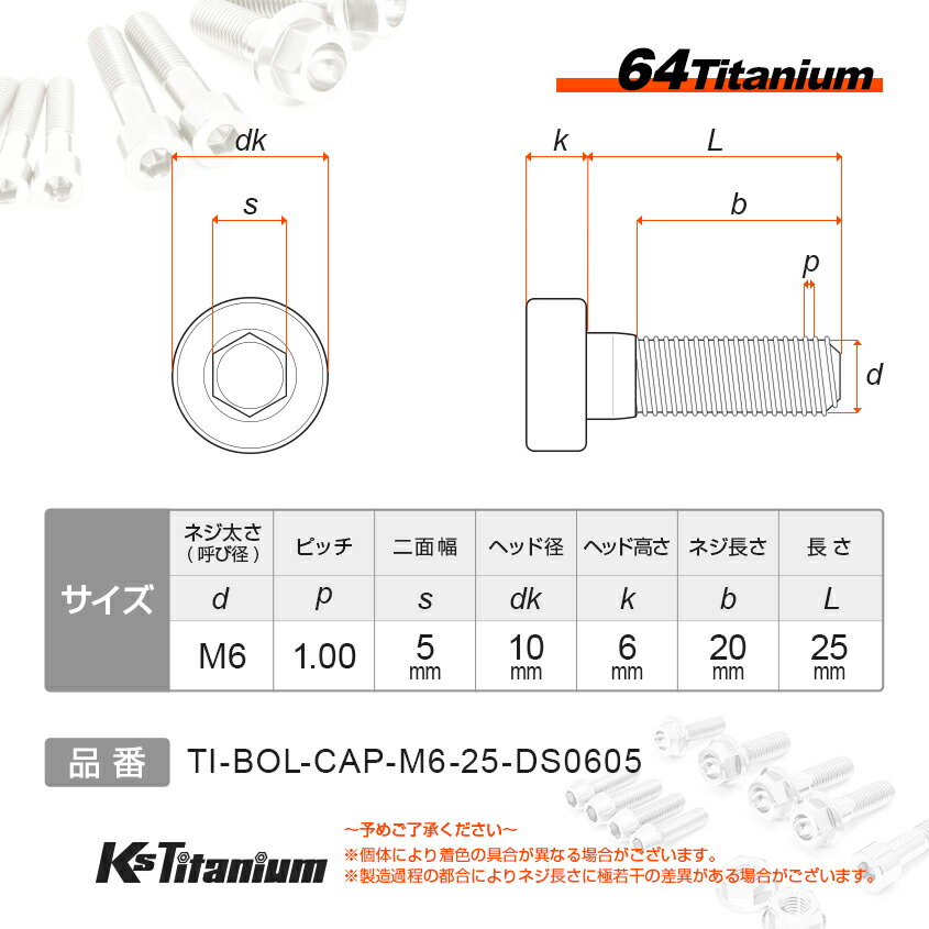 64チタン製 キャップボルト M6×25 ピッチ:1.0 スレッド長:20 のチタンボルトです。 バイク 自転車のカスタムボルトとしてや旧車のレストアに最適です。 【素材】 チタンにアルミとバナジウムをバランスよく組み合わせたTi-6AL-4Vと呼ばれる合金を採用。 アルミ6%、バナジウム4%の6:4の合金であることから64チタンと呼ばれています。 64チタン合金は純チタンに比べて、引張強さで1.7倍以上、耐力は3.8倍以上にもなる優れた強度を持ちながら重さは鉄の6割程度と軽量で腐食にも強い性質を持っています。 「軽い」・「強い」・「錆びない」の三拍子揃った高性能なボルトを是非一度お試しください。 品名:ti-bol-cap-m6-25-ds0605-gldサイズ:M6長さ(mm):25スレッド長(mm):20ヘッド形状:キャップボルト 材質:64チタン 【 Ti-6AL-4V (Grade 5)】カラー:ゴールド 入数:1本