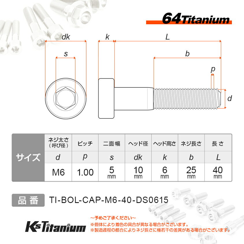 チタンボルト M6×40 P1.0 焼き色 1本 64チタン キャップボルト スレッド 25mm Ti-6Al-4V Gr5 チタン合金 バイク パーツ 自転車 ボルト M6 チタン カスタム ドレスアップ 旧車 レストア 修理 部品