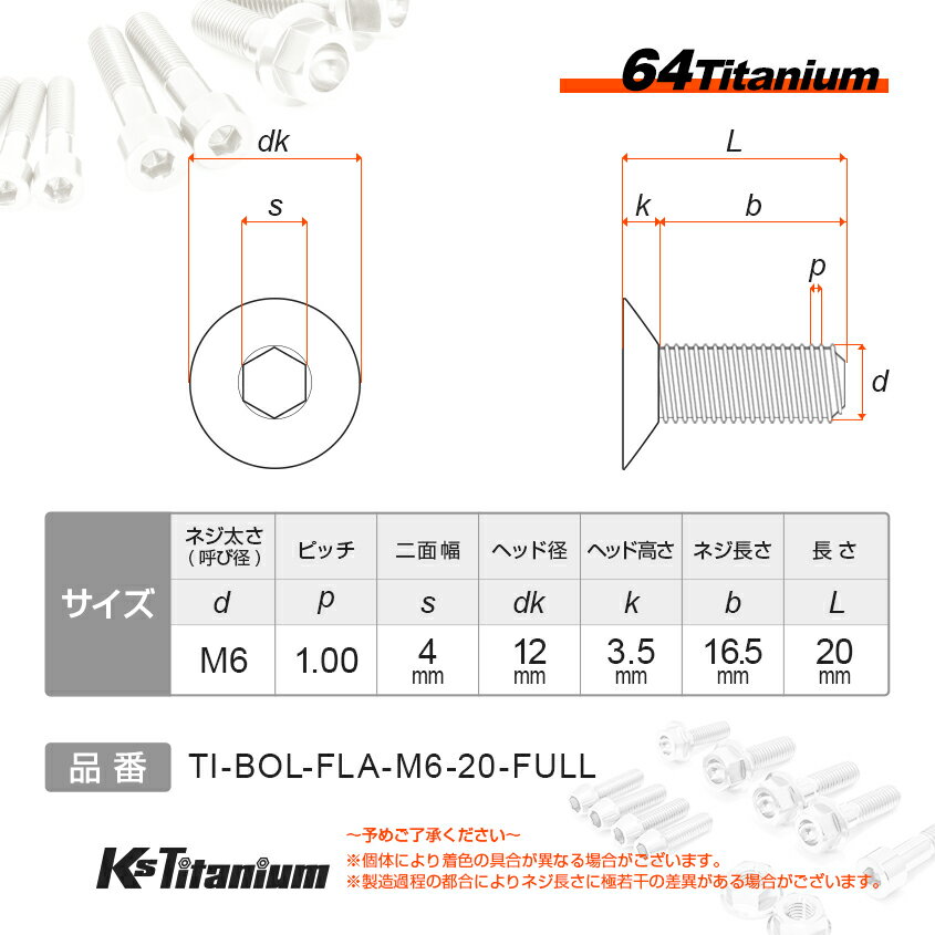 チタンボルト M6×20 P1.0 ブラック 1本売り 64チタン 六角穴付き皿ボルト M6 全ネジ バイク レストア パーツ チタン カスタム ドレスアップ 旧車 レストア 修理 部品