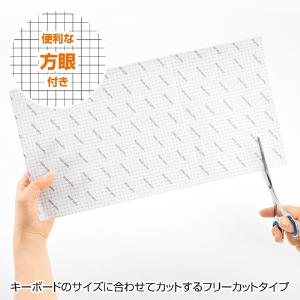 特長 ●様々なノートパソコンに対応する、シートタイプのマルチキーボードカバーです。 ●テンキー付きのワイドノートに対応したサイズです。 ●フリーカットタイプなので、好きなサイズにカットできます。 ●はくり紙に方眼が印刷されているので、カットしやすくなっています。 ●0.15mmの超薄・高透明素材で、キーボードの文字が見やすく快適に入力できます。 ●ぴったり密着したシートで水やホコリの浸入からキーボードを守ります。 ●キーボードから発するパチパチ音をカットします。 ※キーボードの形状、構造により効果は異なります。 ●うっかりタバコの灰を落としてしまっても大丈夫、耐熱素材でキーボードを守ります。 ●燃やしても有害な物質を発生しません。 ●薄くて肌触りが良いので、かけたまま快適な入力作業が行えます。 ●粘着性のあるシートなので、ピタっと張り付きます。 ※表面がシボ状になっているパソコンなどでは、粘着性能が落ちる場合があります。その場合は付属の両面テープを使用してください。 仕様 ■サイズ:W385×D0.15×H200mm ■素材:エーテル系ポリウレタン ■付属品:両面テープ(250×5mm)×2本 対応機種 ■対応機種:ほとんど全てのノートパソコン ※ただしW380×D250mm以下のキーボードサイズに限ります。 ※特殊な形状をしたキーボードには対応しません。