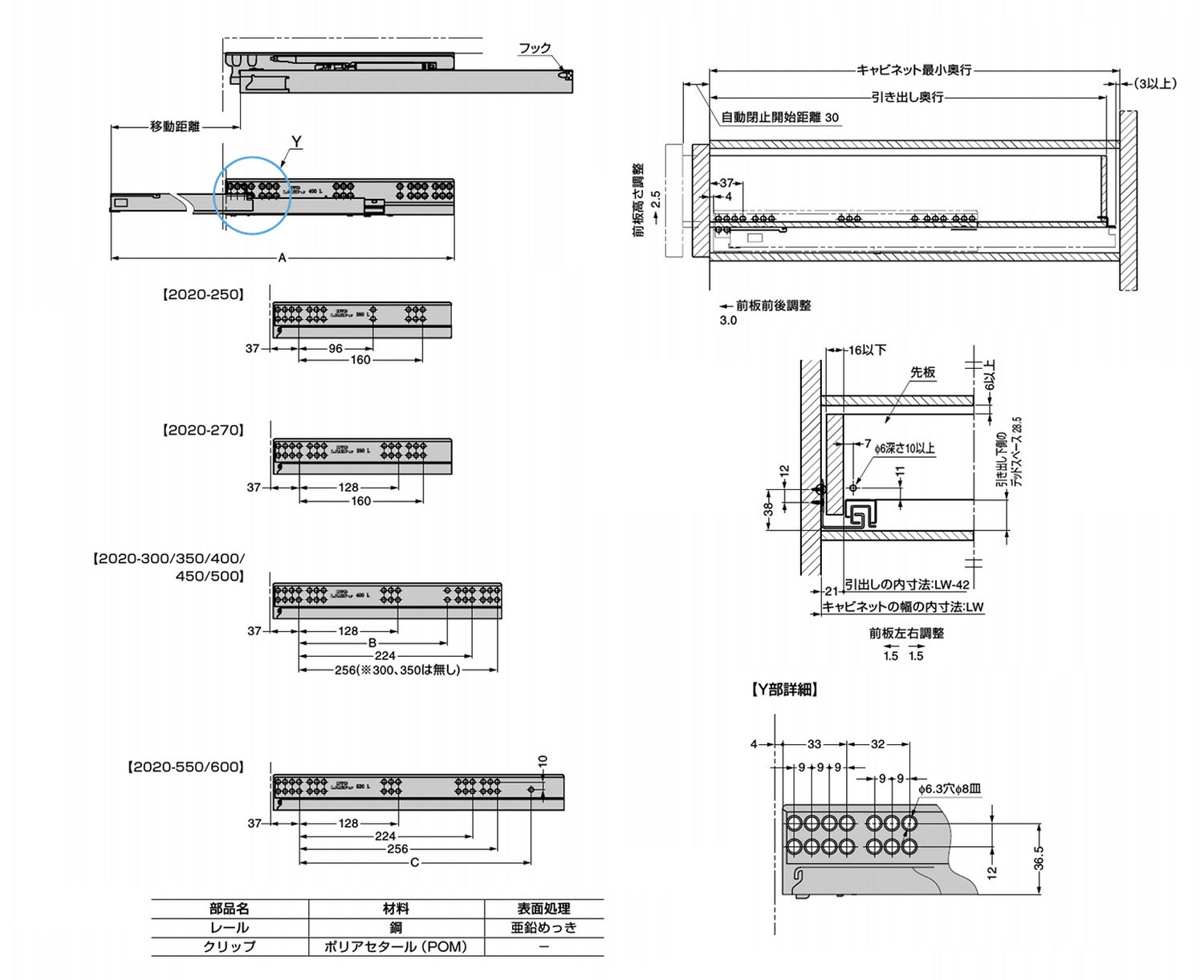 ●3段引のスライドレールです。 ●スライドレールが外側から見えないため、キャビネットなどのデザイン性を損ないません。 ●セルフ&ソフトクロージング機構は、閉じる約30 mm手前から働きます。 ●脱着レバー操作で引き出しの取り外しができます。 ●三次元調整機能付です。ダイヤル操作で引き出しの位置を上下2.5 mm、前後3 mm、左右±1.5 mmの範囲で調整できます。 推奨ねじ(ビスは付属しておりません) ●十字穴付皿タッピンねじ 呼び4 販売単位:セット(2本で1セット) 10セット以上は価格応相談
