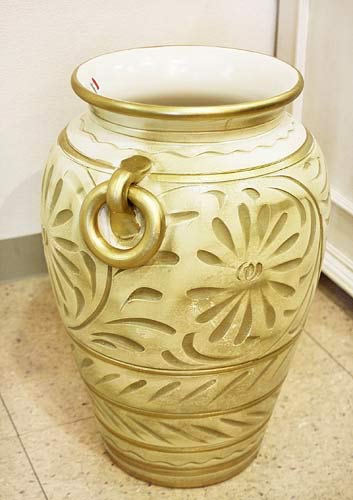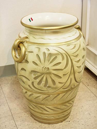 【メーカー直送品:宅配便発送(代引× 後払× 同梱× ラッピング× 対応不可)】 イタリア中部トスカーナ地方の有名な陶器メーカーから直輸入された陶器傘立てです。 つぼ型のどっしりしたタイプで、安定感があり安心してお使いいただけます。 イタリア伝統の陶器で、厚めの焼きが特徴。 重厚感があり、しっかりしています。 アンティークアイボリーの優しい色合いは落ち着いた雰囲気で、とてもシック。 さらに陶器が生焼きのときに製作する伝統的な手法により、クラシカルな装飾を施しました。 熟練した職人が一つ一つ丁寧に仕上げています。 もちろん、傘立てとしてだけでなく、大花瓶として大きくアレンジフラワーを活けても素敵です。 皆様のアイディアでさまざまにお使いください。 サイズ:幅27cm 奥行き27cm 高さ45cm 通常宅急便(お玄関渡し) 送料無料 ※写真はサンプル品です。全て手仕上げのため、塗装の色味や仕上がり具合などには個体差がございます。個体差が理由での返品交換はお受けできませんのでご了承下さい。【送料について】注文前でもお見積いたしますのでお問い合わせ下さい ★複数品のご注文、当店送料表適用外の送料(直送・別送、大型品、設置付などの特別配送)など、ショッピングカートで自動計算できない送料は受注後にお知らせいたします。