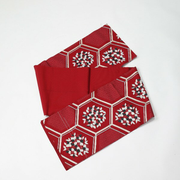 袋帯 亀甲柄 正絹 えんじ色 シルク レッド×ゴールド 【SS】 【中古】