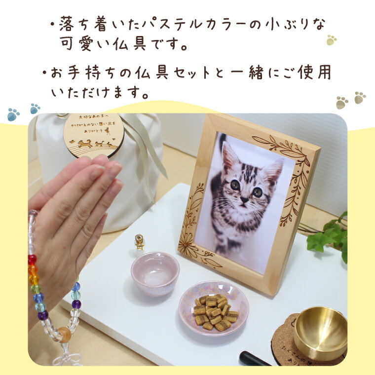 パステルカラーがかわいいミニ仏具。小ぶりで小さく、可愛いのでスペースがない方でも置いて頂けます。 シンプルで使いやすく、お手持ちの仏具とご一緒にお使いいただけます。 愛しかったあの子を沢山ご供養してください。 サイズ:直径4.5cm 、高さ2.8cm、重さ30g 使用例、イメージ内のフォトフレーム、ほか仏具は付属しませんのでご注意ください。 どうぞ毎日手を合わせて、大切な故人様や、ご家族同様だったペットちゃんをご供養してください。 ・仏具は一点一点大切にお作りしています。・パール加工及びオーロラ加工における模様の出方には個体差があります。・気候や湿度により均等に模様が出ない場合がありますが、機械で作られていない職人の手作りの味のためでございます。