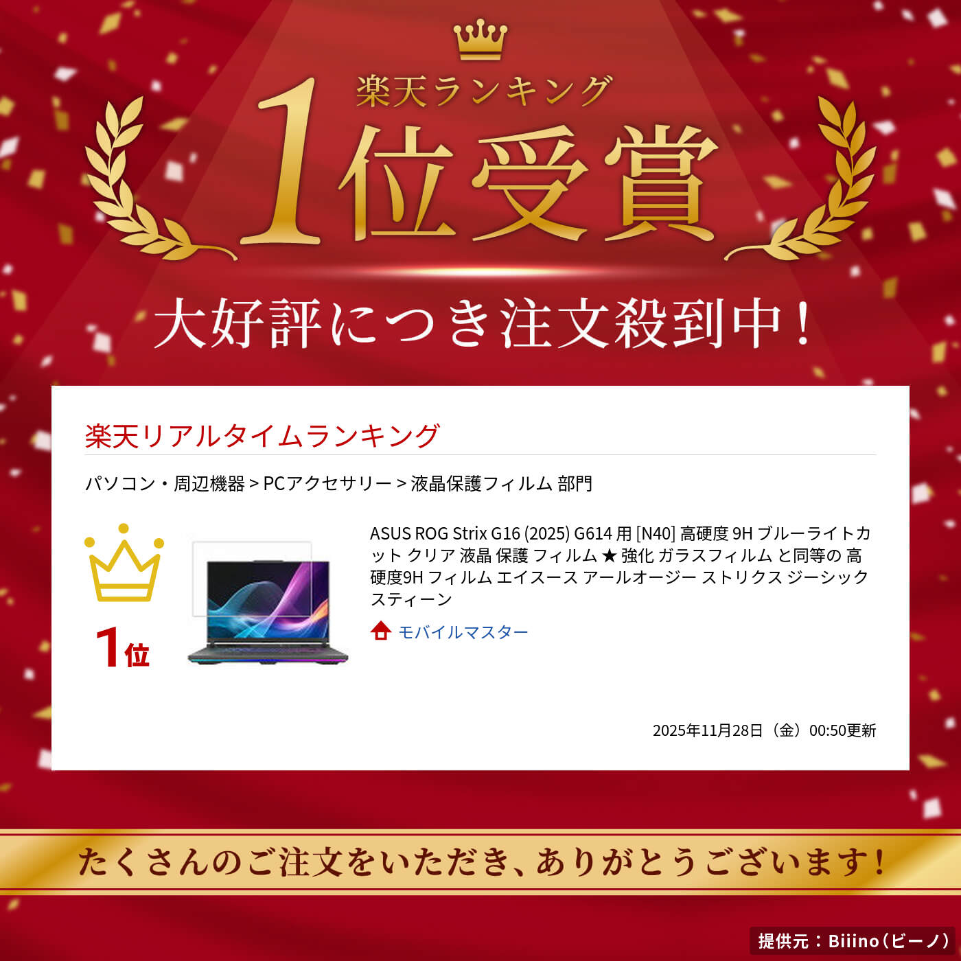 【特徴】 【傷に強い】表面は傷が付きにくい高硬度(9H以上)のため、液晶面をしっかり守ります。 【目に優しい】目に優しいブルーライトカットフィルム バックライトがLEDの液晶ディスプレイから多く発せられているブルーライト(380~495nm)を平均約30%以上カットする液晶保護フィルムです。 【透明クリア】光をキレイに映し出す高透過率(透過率92%)で、透明クリアなフィルムです。 【飛散防止】フィルムの薄さ・しなやかさを保ちながら、高い硬度を実現しています。薄いガラスのように簡単に割れる事はなく、飛散する心配もありません。 【気泡レス】特殊シリコーン粘着剤を使用しているので、自然にエアーが抜け液晶画面に気泡が入りにくいです。 【貼り直しOK】特殊シリコ-ン粘着剤を使用しているので、貼りなおす事が可能です。 ★液晶保護フィルムサイズ 専用サイズ 対応型番:ASUS ROG Strix G16 (2025) G614 G614PR-R9R5070TI G614FR-R9X3D5070TI ★貼り付け失敗無料交換サービス提供中! 貼り付けに失敗した商品をお送り頂ければ、1度だけ新品交換させていただきます。(返送送料のみ、お客様ご負担でお願い致します。) ・こちらの商品は一般的な使用で汚れや傷から保護するための商品です。 ・こちらの商品を使用したことによるデバイス機器などの故障、損傷、破損、その他の損害につきまして、有形や無形を問わず一切の責任を負いかねますので予めご了承ください。 ・保証の範囲は、いかなる場合でも該当取引の金額を限度とし、過去に遡っての保証を行うことはいたしません。 ・商品改良による仕様変更に伴い表記と実際の仕様が異なる場合がございます。 【こういう方におすすめ/関連ワード】 画面割れ 画面傷 画面保護 液晶 フィルム スマホフィルム シリコン ガラスじゃない 割れない 画面 守る カバー 無傷 ゲーム用 スクリーンプロテクター フィルムおすすめ ランキング 保護フィルム オススメ 画面保護フィルム 適合 軽い 軽量 四隅 端っこ 貼り方 動画あり 失敗した 貼るだけ 貼り直し可 貼り付け失敗サービス サイズ調整 サイズ調整カット 交換無料 高品質 長持ち 丈夫 高耐久 しっかり保護 汚れ防止 特殊 コーティング プラスチック 気泡 消える 自然に抜ける 粘着力 低粘着 見やすさ重視 有機el