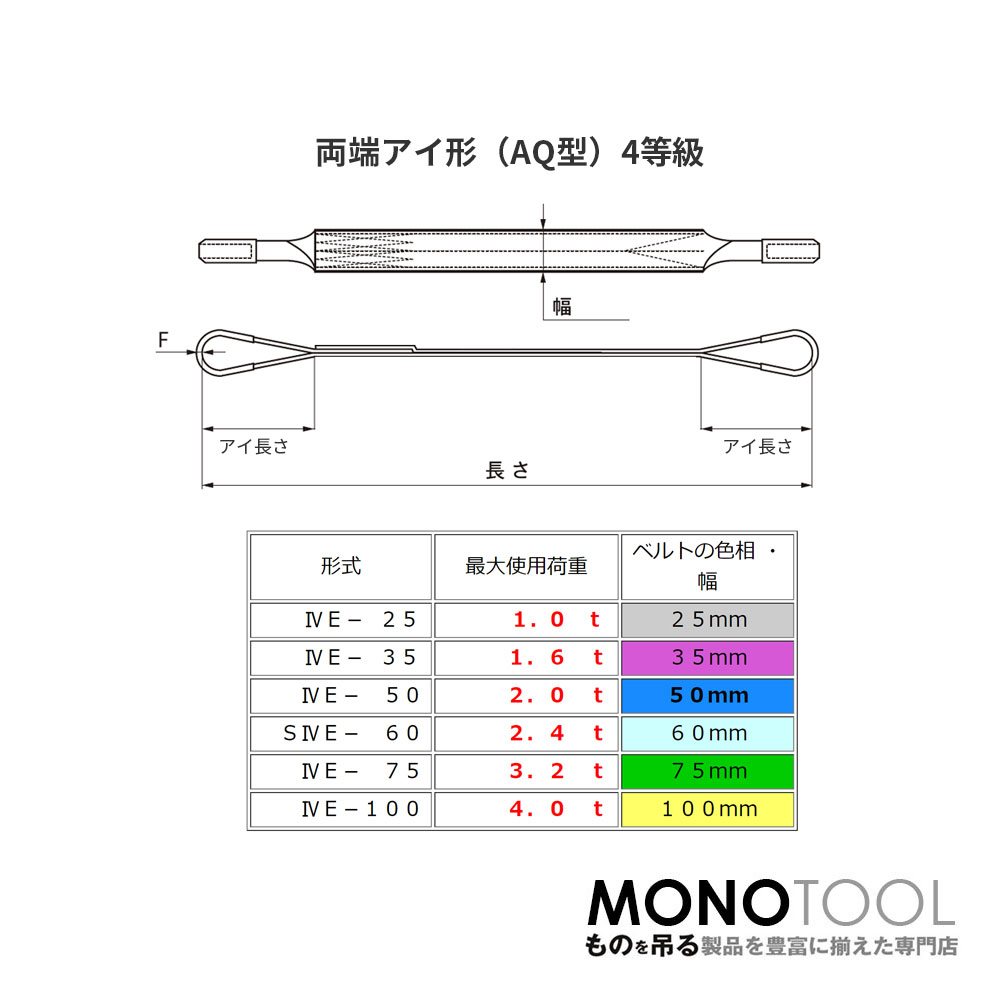 日本製の4等級スリングベルト 豊彰繊維工業のAQスリング 両端アイ形(E型)幅35mm×1mです。 国内有名ブランド原糸を使用し、特許製法で仕上げた非常に柔らかく作業性が良いベルトスリングです。 スーパー等級(4等級:JIS相当)は、3等級と比べてスリング幅に対し最大使用荷重が大きく、ワンランク上の機能性を持ったハイクオリティなスリングベルトです。 仕様 ベルトタイプ:AQスリング ポリエステル100% 形状:両端アイ形(E型) ロープ:幅35mm×長さ:1m アイ長さ:250mm 最大使用荷重:1.6t 規格:4等級(JIS相当) 日本製 4E JIS B 8188認証製品 ※商品の使用荷重・寸法詳細などは画像を参考にして下さい。 特徴 豊彰繊維工業 AQスリング ベルトスリング ホウショウは、製品全てを社内で生産し、全工程を一貫して品質を管理しています。 豊富なラインナップから最適な素材とサイズ・長さをお選びいただくことで、軽量物から重量物までしっかり対応いたします。 掲載写真は代表写真となります。 ※モノツールは豊富な吊具を用意しています。リング・フック付きの加工など吊具のカスタマイズ(別注・特注品)をとても得意としております。お気軽にお問い合わせくださいませ! 純国産4等級ベルトスリング AQスリング 両端アイ形(E型)幅35mm×1m 使用荷重:1.6t 紫色 強力ベルトスリング 4E /純国産4等級ベルトスリング AQスリング 両端アイ形(E型)幅35mm×1m 使用荷重:1.6t 紫色 強力ベルトスリング 4E