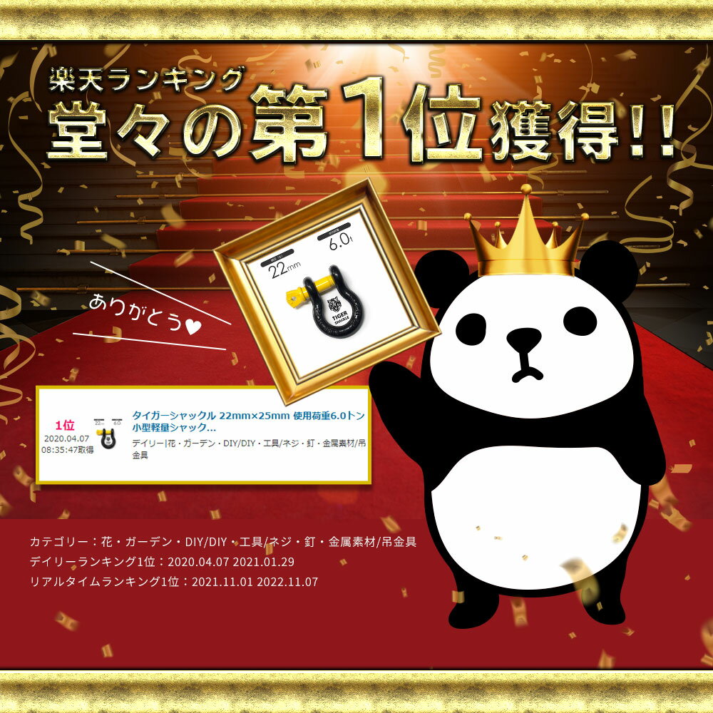 カテゴリー:花・ガーデン・DIY/DIY・工具/ネジ・釘・金属素材/吊金具 デイリーランキング1位:2020.04.07 タイガーシャックル 22mm×25mm 小型軽量シャックル 使用荷重6.5トン 軽いシャックルが欲しい! 錆びないシャックルが欲しい! そんな現場の声に応えました! 錆びない超合金シャックル。重量物吊上・車輛等の牽引・貨物台付・機械巻上 等。 特徴 強度はそのまま 小型化を実現 大幅な軽量(従来の6分の1) 価格も大幅安(従来比) 安心の製造ロットナンバー入り メッキの上から塗装しているので、錆びる心配がなくなりました。 仕様 超合金シャックル 本体:S45C ピン:SCM435 破断荷重:6倍 WWねじ 3mm太ピン WLL,サイズ浮彫刻印 在庫状況・お届け納期 ※メーカー在庫の為、稀に欠品している場合もございます。 欠品中の場合は弊社より納期を連絡させていただきます。 タイガーシャックル ラインアップ サイズ 使用荷重 破断荷重 重量 13mm 2.0t 12.0t 0.29kg 16mm 3.2t 19.2t 0.63kg 19mm 4.7t 28.2t 1.02kg 22mm 6.5t 39.0t 1.53kg 25mm 8.5t 51.0t 2.30kg タイガーシャックル A0022T 22mm×25mm 使用荷重6.5トン 小型軽量シャックル /タイガーシャックル A0022T 22mm×25mm 使用荷重6.5トン 小型軽量シャックル