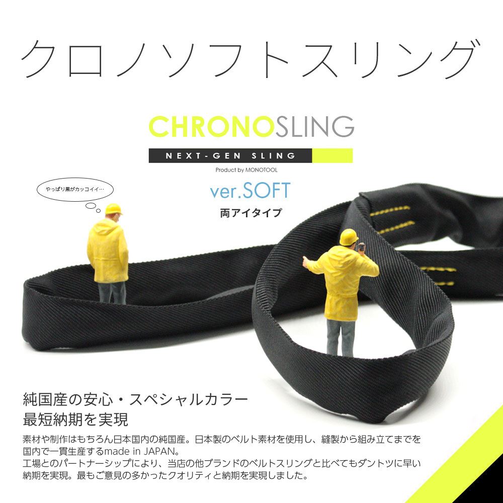 CHRONOSLING(クロノスリング:ソフト) 両アイベルトスリング 0.5t×3m 筒織の表面布の中に心体通すという特別な製法で加工したソフトスリング。強力ポリエステル原糸の束を耐摩耗性に優れたナイロン素材の表面布で包み込んだ繊維スリングです。抜群の柔軟性を体験ください。 仕様 ベルトタイプ:クロノソフトスリング(黒) 素材:心体:ポリエステルスリング、表面布:ナイロン 形状:両端アイ形(E型) アイ寸法:200mm ロープ:長さ:3m 最大使用荷重:0.5t 規格:JIS規格相当品 日本製 使用温度:100℃以下 (吊り方によって安全使用荷重が変わりますので、掲載写真を参照してください。) 特徴 純国産の安心・スペシャルカラー 素材や制作はもちろん日本国内の純国産。日本製のベルト素材を使用し、縫製から組み立てまでを国内で一貫生産するmade in JAPAN。 最短納期を実現 工場とのパートナーシップにより、当店の他ブランドのソフトスリングと比べてもダントツに早い納期を実現。最もご意見の多かったクオリティと納期を実現しました。 他とは異なる特別なツールとして。優れた耐候性・耐久性を発揮 カラーもいわゆる『よくあるカラー』ではなく『ブラック×イエローステッチ』の2トーン仕様。金具取り付け加工・1点吊り・2点吊り・4点吊り仕様への対応可能です。国産ソフトスリング 両アイ 0.5t x 3.0m JIS規格相当品 玉掛け スリングベルト クロノソフトスリング 黒 /国産ソフトスリング 両アイ 0.5t x 3.0m JIS規格相当品 玉掛け スリングベルト クロノソフトスリング 黒