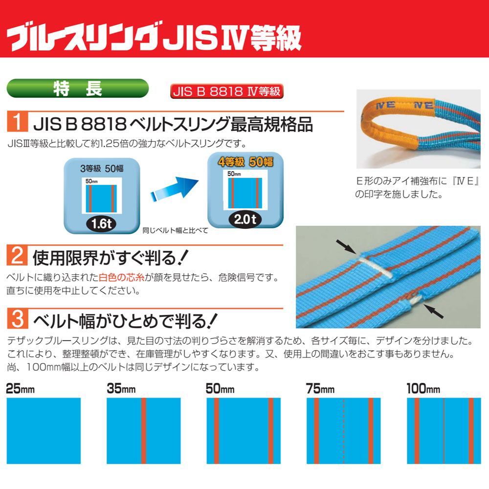 (株)テザック製(TESAC) ブルースリング 4等級 幅35mm メイドインジャパン・長さを簡単に選べる! 安心の日本製ベルトスリングの長さを簡単にオーダーいただけます。是非ベルトスリングのカスタマイズを体験して下さい! 仕様 両端アイ:JIS規格品4等級 材質:ポリエステル 安全使用荷重:1.6t (吊り方によって安全使用荷重が変わりますので、掲載画像を参照してください。) 特徴 ニュースタンダードのJIS4等級 新たな新基準ニュースタンダードのJIS4等級ベルトスリング。JIS3等級の同じベルト幅と比べて約1.25倍の強力なベルトです。 抜群の寸法安定性! ポリエステルは、ナイロンに比べ、荷重をかけた場合の伸びが非常に少ないため、寸法安定性は抜群です。 優れた耐候性・耐久性を発揮! ポリエステルは、ほとんど吸水せず、耐光性能も良いので、屋外での使用には最適な素材です。 使用限界がすぐわかる! ベルトに織り込まれた白色の芯糸が顔を見せたら、危険信号です。直ちに使用を中止してください。ブルースリング 幅35mm 両端アイ形 4E JIS4等級ベルトスリング 1.6t / メーカー テザック TESAC 4等級 JIS規格 日本製 国産 スリングベルト 青色 水色 黄色 両アイ 玉掛け 目通し吊り チョーク吊り 安全荷重 最大使用荷重ブルースリング 幅35mm 両端アイ形 4E JIS4等級ベルトスリング 1.6t