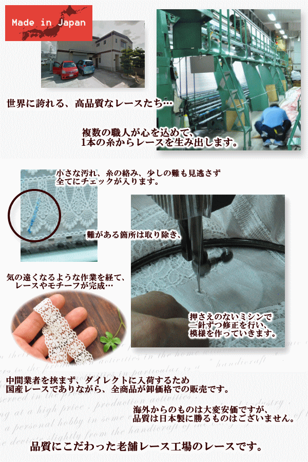 ★ 3,980円以上ご注文で、宅配便・ゆうパケット 送料無料 ★【1】日本郵便 ゆうパケット(メール便) 全国一律 280円■ポストへのお届け(盗難、未投函などの補償なし。日時指定不可。)■厚み3cm、3辺合計60cm以内まで★規定サイズ内に収めるコツ★商品名上に記載の 「#ゆうパケ○点可」 の数字をご参考に、上手にお買い物なさってください。※同一商品を注文した場合、何点まで入るかの目安の数字となります。【下記の場合、宅配便に変更させていただきます↓】・規定サイズを超える場合★同時に送料も変更させていただきます。■「ゆうパケット送料無料」と記載のある商品で、送料無料希望の方はゆうパケットをご選択ください。ただし、「ゆうパケット送料無料」商品をご注文でも、宅配便希望の場合は、宅配便をご選択ください(送料の差額が発生します)。------------------------【2】日本郵便 ゆうパック(宅配便) 全国一律 650円日時指定OK!■3,980円以上のお買い上げでも、配送方法「ゆうパケット」希望にチェックがある場合は、ゆうパケットでのお届けとなります。【ゆうパケット・ゆうパック共通注意事項】※ご注文後に、複数通に分けてのご発送はできかねます。■ロット(生産時期)が異なると、同じ品番のものでもカラー、サイズ、品質が変わります。同じ種類、材料、染料を用いても製造過程において完璧に同じものを再現することが難しく、このような現象はどの商品にも見られます。 詳しくはこちら→前回とは色や幅が異なるという理由での、返品交換はお断りをしていますのでご理解ください。■領収書、明細書は同封しておりません。(エコ、個人情報保護、配送のスピード化などの理由によるため)【1】領収書商品発送後、購入履歴画面の「領収書を発行する」ボタンからPDFで発行できます。(※後払い決済を除く)▼下記の場合は、領収書の発行は出来ません。【後払い決済】運収納印のある払込受領書が公的な領収書となります。【クレジット】お客様ご契約のクレジット会社が発行するご利用明細書が代わりとなります。【コンビニ決済】払込受領証が領収書となります。【全額ポイント支払い】ご請求金額が0円のため発行できません。------------------------【1】明細書▼明細書をお入れしておりません。・「ご注文確定メール」が明細書の代わりとなります。・楽天会員様はご購入履歴からもご確認いただけます。------------------------当店からのメールを必ず受信していただきますよう、「ドメイン指定受信解除」していただきますようお願いいたします。(my-mama@d5.dion.ne.jp と、 auc-my-mama@shop.rakuten.co.jp)【1】商品のカットに関しまして・生地、ブレード、ゴム等、長さを指定してのカットのご依頼はお受けできかねます。(例:1Mを5枚に分けて、1M・2Mを1枚ずつ、など)・カット販売の商品に関しましては、ご注文いただいた数量をつながった状態でお届け致します。(ご注文数が多い場合は途中でカットしたものをお届けする場合がございます。)国産ケミカルレースモチーフ2枚セット日本の歴史あるレース工場で作られたレースモチーフです。お洋服やドレス、衣装の装飾に、インテリアや小物、カルトナージュ等にアイデア次第で色々とお使いいただけます。国内のこちら(↓)の工場で作られています。国外では行わない細かい作業をいくつも行い生産されているレースモチーフです。【商品詳細】■サイズ 画像をご確認下さい。■個数2枚セット■カラーオフホワイト■ゆうパケット可能■おすすめカテゴリその他の国産レースはこちらからサイズの御確認はこちら ↓