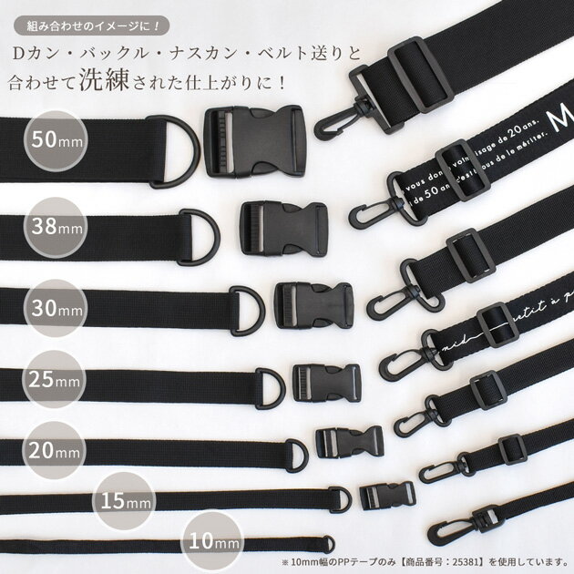 ★ 3,980円以上ご注文で、宅配便・ゆうパケット 送料無料 ★【1】日本郵便 ゆうパケット(メール便) 全国一律 280円■ポストへのお届け(盗難、未投函などの補償なし。日時指定不可。)■厚み3cm、3辺合計60cm以内まで★規定サイズ内に収めるコツ★商品名上に記載の 「#ゆうパケ○点可」 の数字をご参考に、上手にお買い物なさってください。※同一商品を注文した場合、何点まで入るかの目安の数字となります。【下記の場合、宅配便に変更させていただきます↓】・規定サイズを超える場合★同時に送料も変更させていただきます。■「ゆうパケット送料無料」と記載のある商品で、送料無料希望の方はゆうパケットをご選択ください。ただし、「ゆうパケット送料無料」商品をご注文でも、宅配便希望の場合は、宅配便をご選択ください(送料の差額が発生します)。------------------------【2】日本郵便 ゆうパック(宅配便) 全国一律 650円日時指定OK!■3,980円以上のお買い上げでも、配送方法「ゆうパケット」希望にチェックがある場合は、ゆうパケットでのお届けとなります。【ゆうパケット・ゆうパック共通注意事項】※ご注文後に、複数通に分けてのご発送はできかねます。■ロット(生産時期)が異なると、同じ品番のものでもカラー、サイズ、品質が変わります。同じ種類、材料、染料を用いても製造過程において完璧に同じものを再現することが難しく、このような現象はどの商品にも見られます。 詳しくはこちら→前回とは色や幅が異なるという理由での、返品交換はお断りをしていますのでご理解ください。■領収書、明細書は同封しておりません。(エコ、個人情報保護、配送のスピード化などの理由によるため)【1】領収書商品発送後、購入履歴画面の「領収書を発行する」ボタンからPDFで発行できます。(※後払い決済を除く)▼下記の場合は、領収書の発行は出来ません。【後払い決済】運収納印のある払込受領書が公的な領収書となります。【クレジット】お客様ご契約のクレジット会社が発行するご利用明細書が代わりとなります。【コンビニ決済】払込受領証が領収書となります。【全額ポイント支払い】ご請求金額が0円のため発行できません。------------------------【1】明細書▼明細書をお入れしておりません。・「ご注文確定メール」が明細書の代わりとなります。・楽天会員様はご購入履歴からもご確認いただけます。------------------------当店からのメールを必ず受信していただきますよう、「ドメイン指定受信解除」していただきますようお願いいたします。(my-mama@d5.dion.ne.jp と、 auc-my-mama@shop.rakuten.co.jp)【1】商品のカットに関しまして・生地、ブレード、ゴム等、長さを指定してのカットのご依頼はお受けできかねます。(例:1Mを5枚に分けて、1M・2Mを1枚ずつ、など)・カット販売の商品に関しましては、ご注文いただいた数量をつながった状態でお届け致します。(ご注文数が多い場合は途中でカットしたものをお届けする場合がございます。)【 卸売り 】ワンタッチ バックル ブラック38mm/50mmバッグやポーチのベルト調節に欠かせないパーツ。プラスチックで軽く、少し丸みがかかった体にフィットする形状です。サイズが豊富で作品のイメージで合わせられる。シンプルなバックルは使い勝手バツグンです。組み合わせてお使いいただけるパーツもブラックで統一感が出て作品の完成度をグッと引き上げます。たくさん作る作家さん向けのまとめ売り販売です。こちらは業務用(卸売り)の38mm・50mmサイズのページとなります。15mm~30mmの卸売りはこちら単品はこちらからボディバッグ手作りキットをみる合わせてぴったりなパーツはこちら↓ロゴ&無地 持ち手テープPPテープ 持ち手テープPPテープ 10mm幅卸売り Dカン卸売り ナスカン卸売り ベルト送り【商品詳細】■商品番号38mm(222453-8)、50mm(222453-50)■素材プラスチック■サイズ・数量約38mm 40個 / 約50mm 20個 ※サイズ詳細は画像参照※サイズによって入り数が異なります。■カラーブラック■リニューアル23/2/22 サイズを50mmを追加■ゆうパケットゆうパケット不可 宅配便での発送となります。■ご注意※サイズによって形状がそれぞれ異なります。・ロットにより約1~2mm程度サイズが異なる場合や色味が変わる場合がございます。前回お買い求めいただいた商品と違う場合がございます。・汚れ、小キズ、バリなどがある場合がございます。・合わせてお使いいただけるナスカンやDカン、ベルト送りは全く同じサイズ、全く同じお色でない場合がございます。上記の内容は生産工程上、避けられない現象となりますので何卒ご容赦ください・こちらの商品は湾曲している為、測る場所によって寸法の誤差が出ます。・画像では100%同じお色を表現することはできません。実際のイメージと異なる場合がございます。上記の理由での返品交換は承つことは出来ません。予めご了承の上、お買い求めお願い申し上げます。■その他のおすすめバックルの関連商品はこちら ↓ 38mm・50m