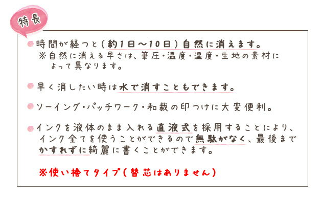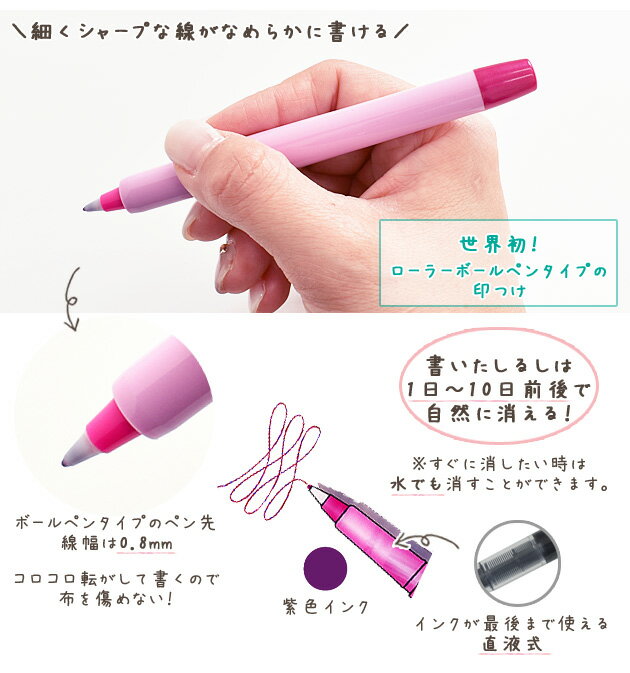 ★ 3,980円以上ご注文で、宅配便・ゆうパケット 送料無料 ★【1】日本郵便 ゆうパケット(メール便) 全国一律 280円■ポストへのお届け(盗難、未投函などの補償なし。日時指定不可。)■厚み3cm、3辺合計60cm以内まで★規定サイズ内に収めるコツ★商品名上に記載の 「#ゆうパケ○点可」 の数字をご参考に、上手にお買い物なさってください。※同一商品を注文した場合、何点まで入るかの目安の数字となります。【下記の場合、宅配便に変更させていただきます↓】・規定サイズを超える場合★同時に送料も変更させていただきます。■「ゆうパケット送料無料」と記載のある商品で、送料無料希望の方はゆうパケットをご選択ください。ただし、「ゆうパケット送料無料」商品をご注文でも、宅配便希望の場合は、宅配便をご選択ください(送料の差額が発生します)。------------------------【2】日本郵便 ゆうパック(宅配便) 全国一律 650円日時指定OK!■3,980円以上のお買い上げでも、配送方法「ゆうパケット」希望にチェックがある場合は、ゆうパケットでのお届けとなります。【ゆうパケット・ゆうパック共通注意事項】※ご注文後に、複数通に分けてのご発送はできかねます。■ロット(生産時期)が異なると、同じ品番のものでもカラー、サイズ、品質が変わります。同じ種類、材料、染料を用いても製造過程において完璧に同じものを再現することが難しく、このような現象はどの商品にも見られます。 詳しくはこちら→前回とは色や幅が異なるという理由での、返品交換はお断りをしていますのでご理解ください。■領収書、明細書は同封しておりません。(エコ、個人情報保護、配送のスピード化などの理由によるため)【1】領収書商品発送後、購入履歴画面の「領収書を発行する」ボタンからPDFで発行できます。(※後払い決済を除く)▼下記の場合は、領収書の発行は出来ません。【後払い決済】運収納印のある払込受領書が公的な領収書となります。【クレジット】お客様ご契約のクレジット会社が発行するご利用明細書が代わりとなります。【コンビニ決済】払込受領証が領収書となります。【全額ポイント支払い】ご請求金額が0円のため発行できません。------------------------【1】明細書▼明細書をお入れしておりません。・「ご注文確定メール」が明細書の代わりとなります。・楽天会員様はご購入履歴からもご確認いただけます。------------------------当店からのメールを必ず受信していただきますよう、「ドメイン指定受信解除」していただきますようお願いいたします。(my-mama@d5.dion.ne.jp と、 auc-my-mama@shop.rakuten.co.jp)【1】商品のカットに関しまして・生地、ブレード、ゴム等、長さを指定してのカットのご依頼はお受けできかねます。(例:1Mを5枚に分けて、1M・2Mを1枚ずつ、など)・カット販売の商品に関しましては、ご注文いただいた数量をつながった状態でお届け致します。(ご注文数が多い場合は途中でカットしたものをお届けする場合がございます。)Sewline自然に消えるローラーペン 0.8mmソーイング、パッチワーク、和裁などの印つけに便利♪書いたしるしが1日~10日前後で消えるペンです。世界初!ローラーボールペンタイプの印つけで、布の上でコロコロ転がして滑らかに書けるため布を傷めず、細くシャープな線を書くことができます。また、インクを液体のまま入れる直液式を採用することにより、インク全てを使うことができるので無駄がなく最後までかすれずに綺麗に書くことができて経済的◎しるしは、水でも消すことができます。【商品詳細】■商品番号FAB50027■サイズ全長:約14.3cm線の太さ:約0.8mmパッケージサイズ:約200mm×45mm×13mm■個数1本■ゆうパケット20点まで可■ご注意・インク色は紫となります。・ご使用前には必ず布端でテストをしてください。・アイロンをかける場合は、色が完全に消えてからご使用ください。・ご使用後は必ずしっかりとキャップをしてください。・幼児の手の届くところには置かないでください。・直射日光のあたる場所や、高温多湿になる場所には放置しないでください。※使い捨てタイプとなります。(替芯はありません)その他、パッケージの注意事項をご確認の上、ご利用ください。■おすすめカテゴリその他の手芸道具はこちら\ 関連商品 /スティラ 水で消えるローラーペンその他のソーライン商品はこちらその他の手芸道具はこちら